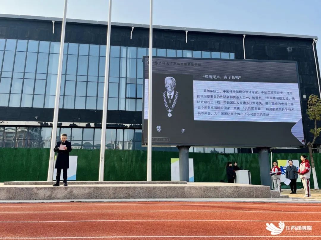 学校校长高圣奉以《隐姓埋名三十载,国之重器写忠诚》为题,带领全体师生重温黄旭华院士的壮阔人生。放映的纪录片《黄旭华:我的“深潜”人生》片段,简要回顾了我国核潜艇研制的艰难历程、无数科研人无私奉献的感人瞬间。