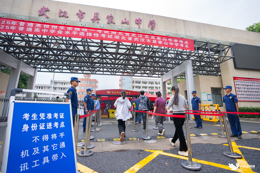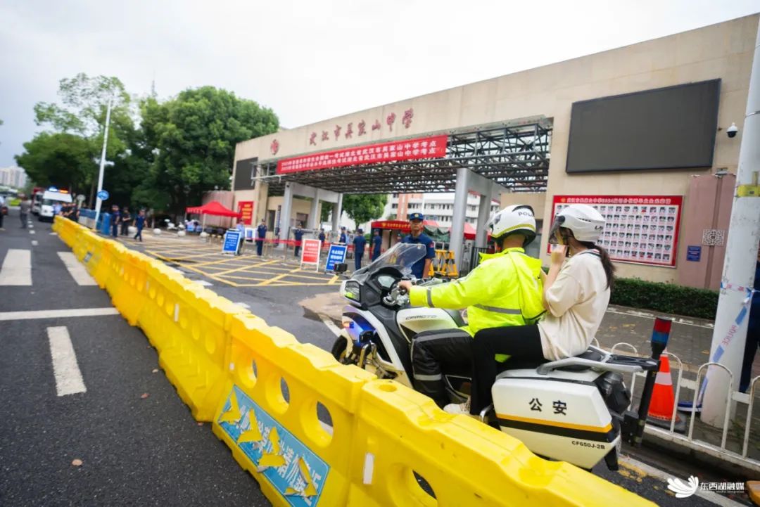 吴家山中学考点外,汉警快骑队员将忘带准考证考生送至考场。