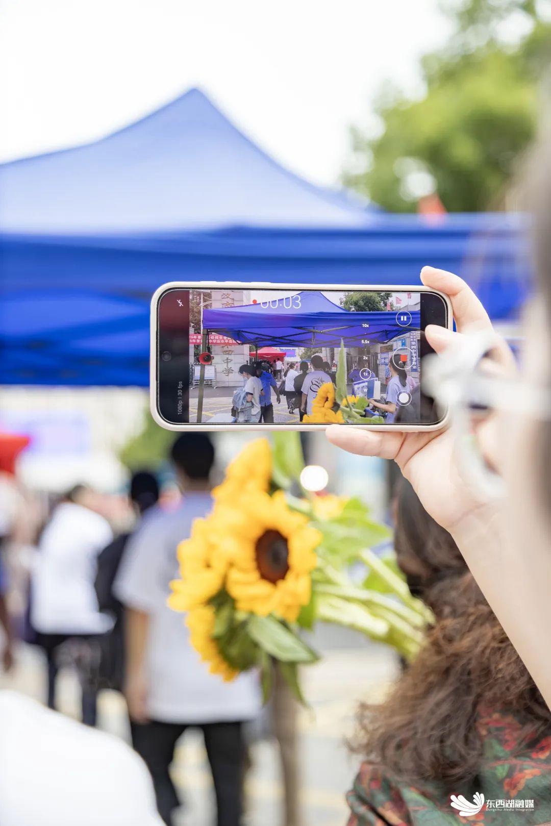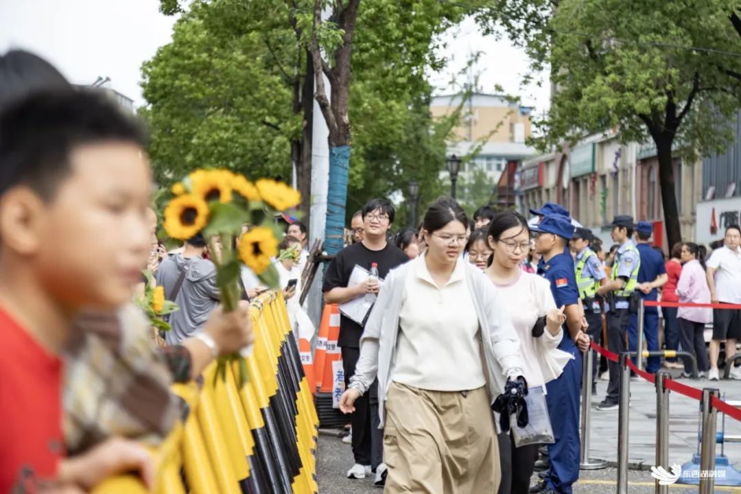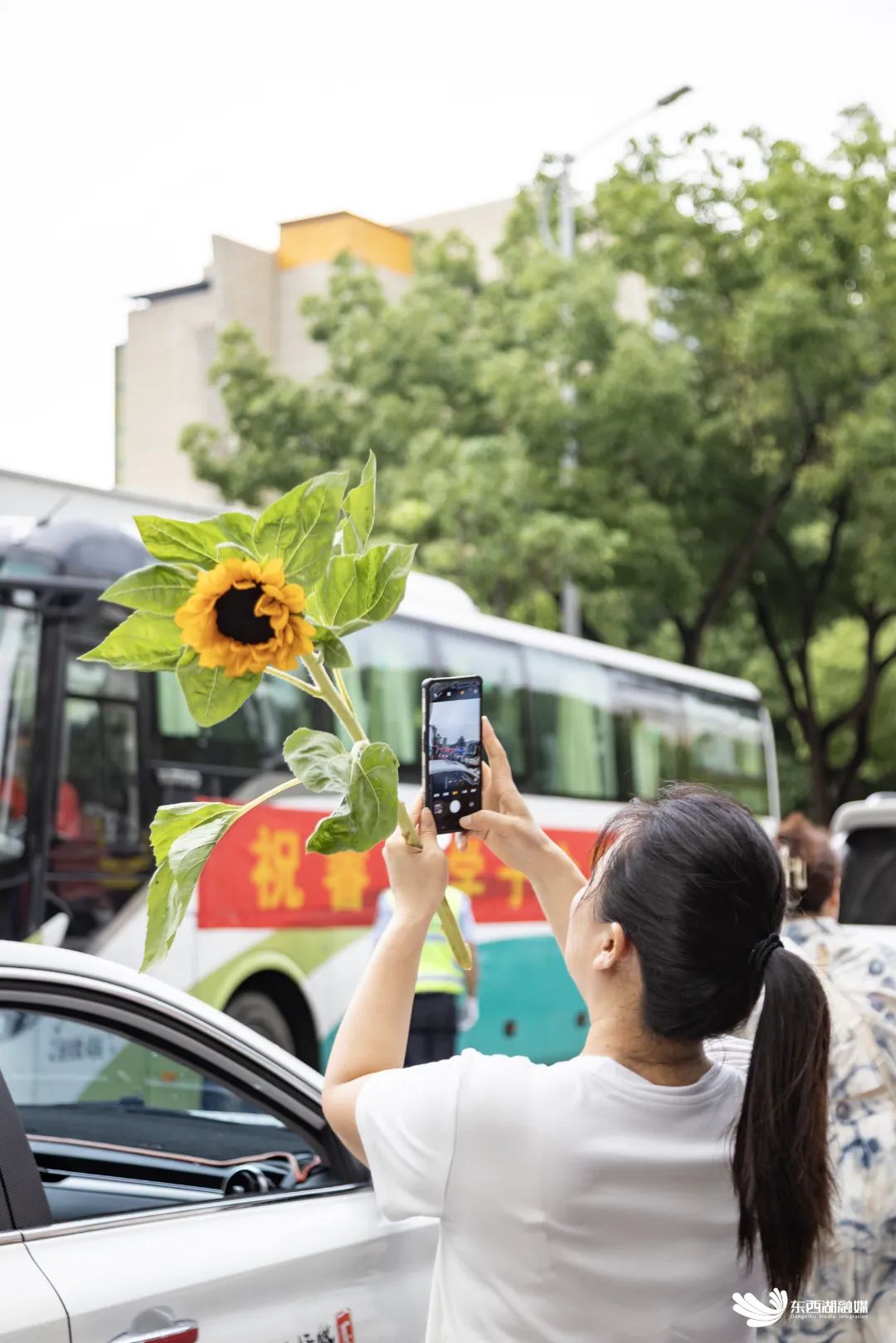 弟弟妹妹前来送考,众人手中高举的向日葵鲜艳夺目,洋溢着喜悦与期待。
