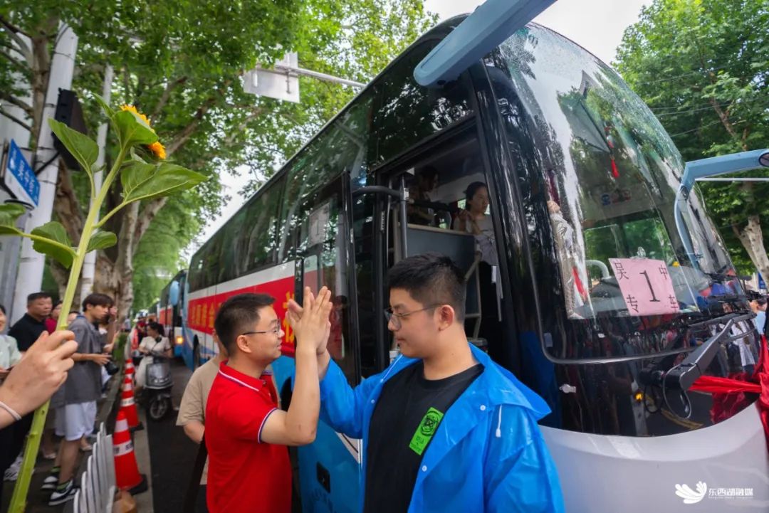 送考大巴直抵考场,为考生保驾护航。在车门打开的瞬间,“一拍即中”是最好的祝福。