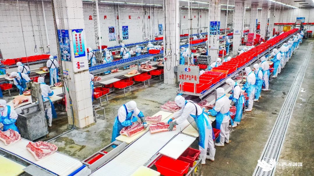 生产线上工人正在对猪肉进行分割。