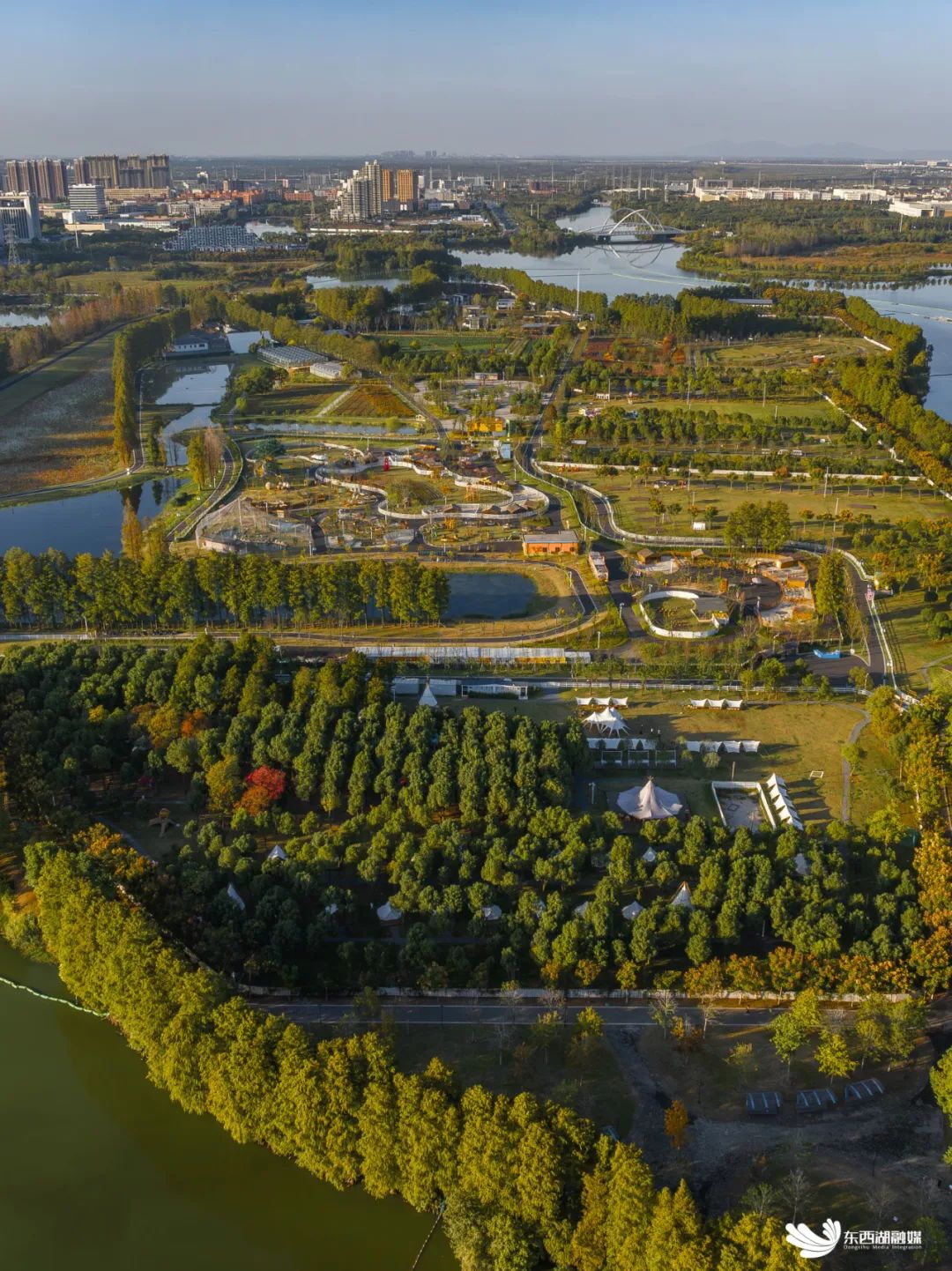 湖畔俯瞰,林木葱茏,野奢营地上,白色帐篷点缀其上。