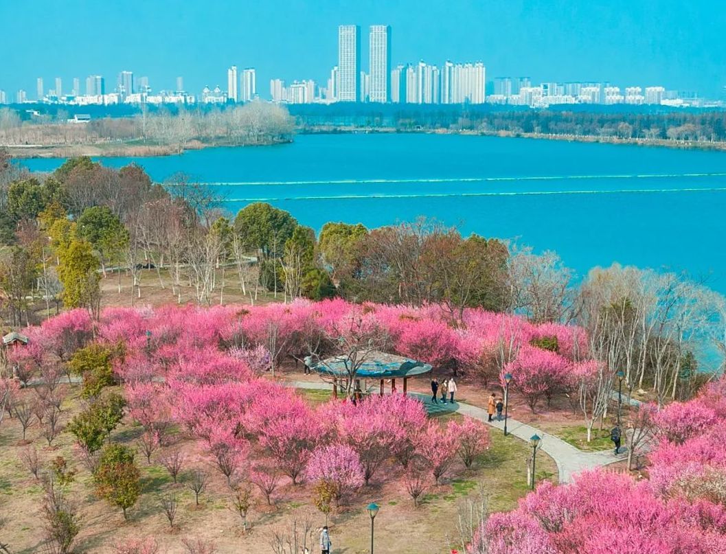 早春时节,湖畔的梅花次第绽放,烂漫如云霞铺展,与湖面倒影相映成趣。微风过处,暗香浮动,引得蜂蝶翩跹其间。市民们在梅花树下扎营,花瓣随风轻舞,落于帐篷,诗意盎然。一家老小围炉煮茶,笑语连连,尽享宁静美好。