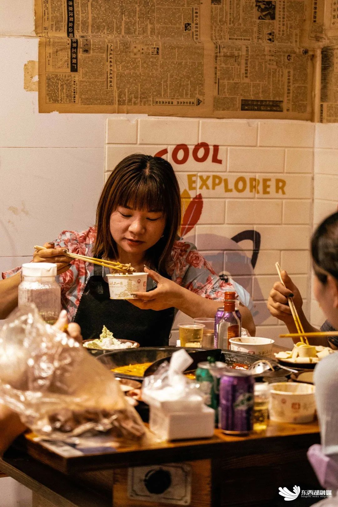 店里幽默创新的标语,搞怪风趣的图片,贴满整个墙面。“吃的有意见请当面批评指正,莫到处乱说”就算面对食客刁钻的点评,这份从骨子里透出的直爽,让顾客直呼“巴适的很”。