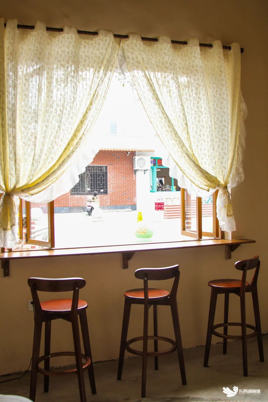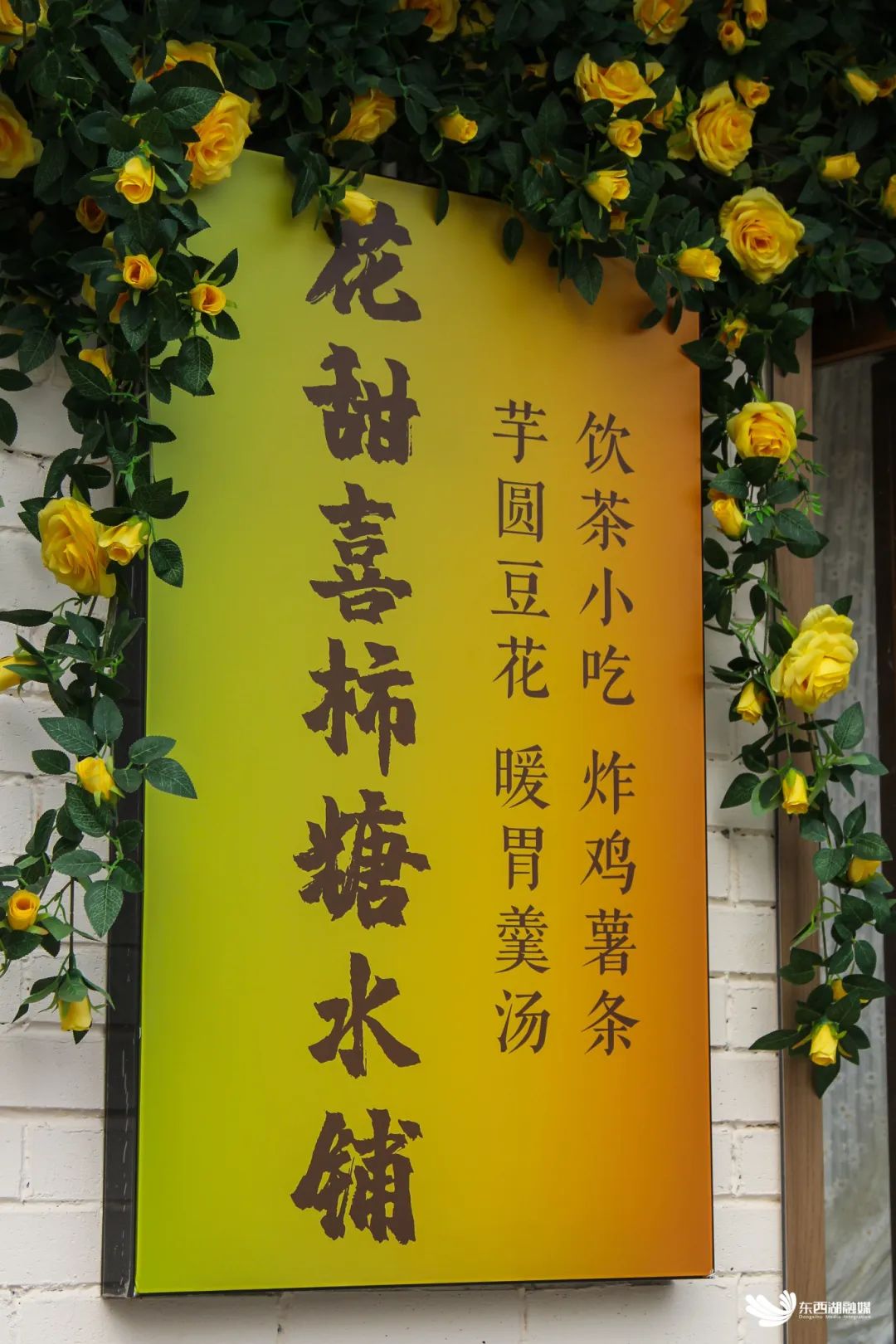 绿叶黄花爬满墙壁,木质窗户静静敞开,一阵风来,白色蕾丝窗帘微微扬起……走进花甜喜柿糖水铺,处处都能感受到甜美的芬芳和田园的惬意,木质家具、碎花桌布、景德镇订制的手绘茶具,点一个芒果布丁,吃一份豆花,泡上一壶茶,看窗外云卷云舒,美好浪漫的时光在这里被具象化。