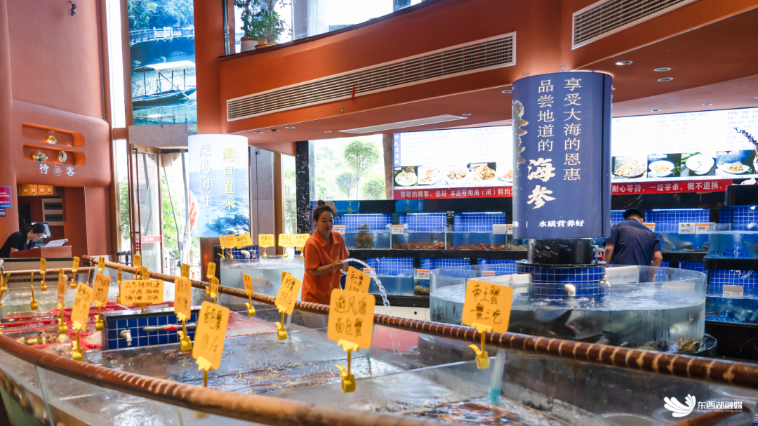 晓江湖的特色是鱼类菜肴。在一楼大堂,数十种河鲜和海鲜在这里集中展示,仿佛一个微缩水族馆。帝王蟹、波士顿龙虾、东星斑、太湖甲鱼……顾客现场看鱼点鱼,下单后食材直接拿到厨房制作。