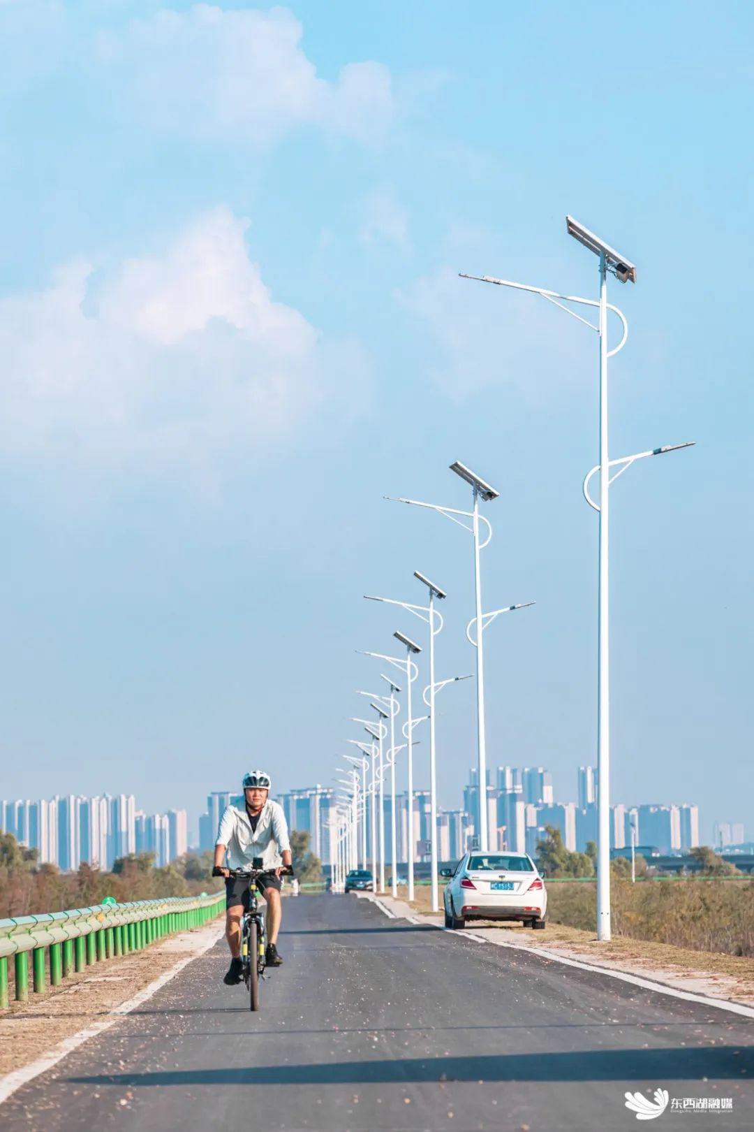 沿着蜿蜒的绿道前行,首先抵达湿地科普宣教馆。透过落地玻璃窗,能望见馆外碧波轻漾,芦苇随风摇曳,仿佛在诉说古云梦泽的千年故事。继续骑行至杜公湖水上运动中心,五彩桨板如漂浮的花瓣点缀湖面,运动爱好者们破水前行,将落日余晖搅成流动的金色绸缎。