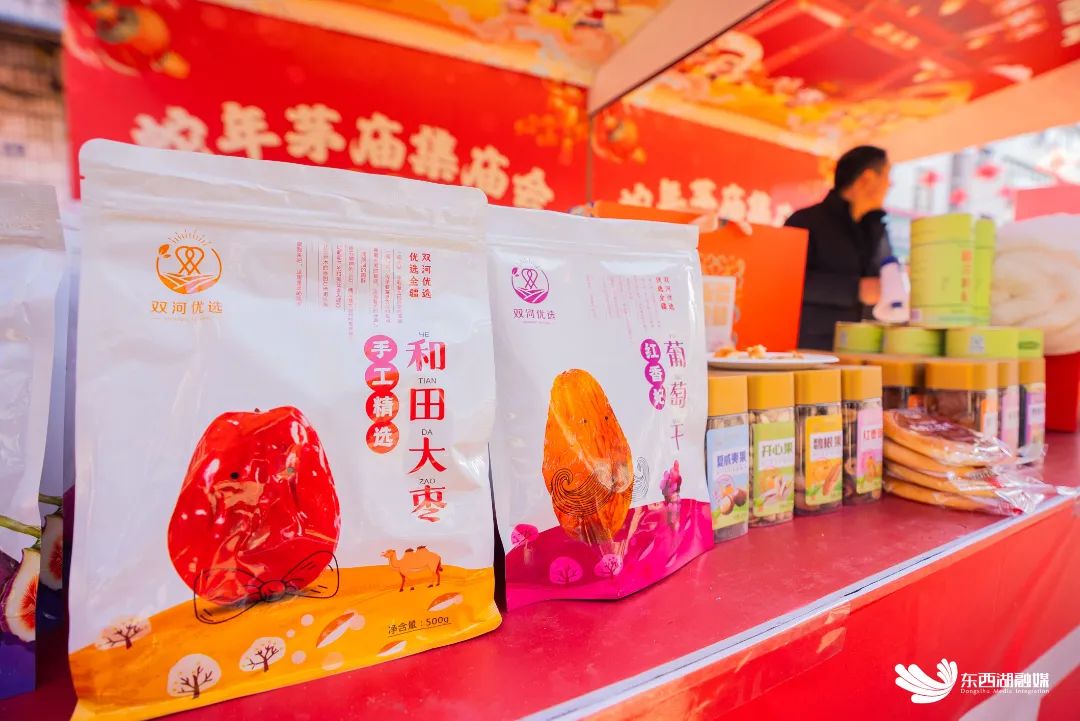 本届庙会100个摊位(企业)参与,柏泉年货、咸丰年货、新疆年货、阳雀湖年货四大特色年货摊位,飘香街头。北疆高山牌牛羊肉、夏黑葡萄乌龙茶、纸皮巴旦木、灵峪双河沙棘汁等59种新疆特色农产品,咸丰黑猪、腊味、茶叶等30种特色农产品及湖南樟树港辣椒产品,让人目不暇接,多样性年货让游客们享受大江南北吃、喝、娱、乐、购一站式体验。