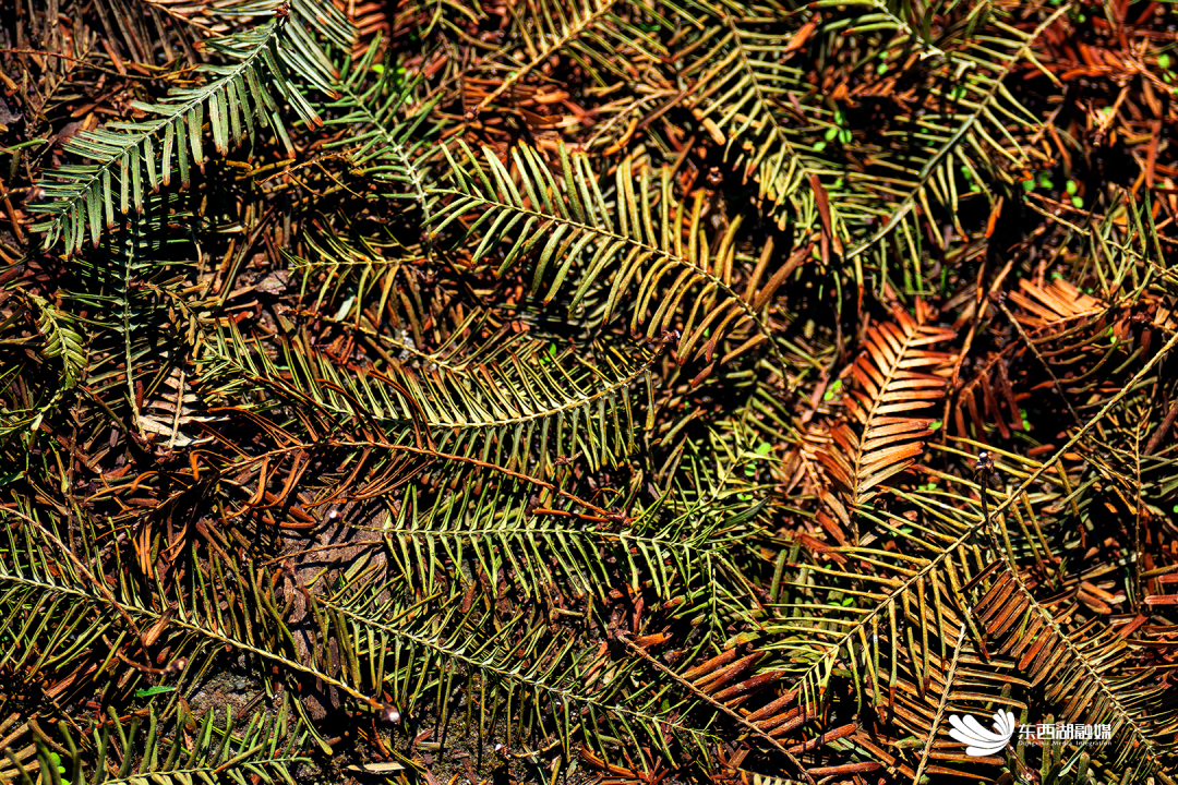 纤细修长的杉树叶扑簌簌随风飘落,绵绵软软地铺满一地,织成限定款的毯子。