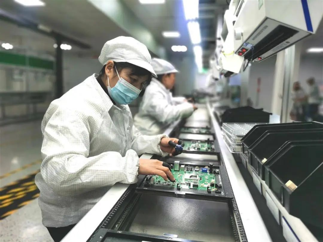 2月18日,工人们安装主板上的零部件。