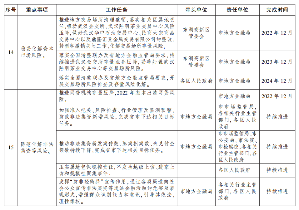 1.建立和完善地方金融监管责任体系。贯彻落实《防范和处置非法集资条例》(国务院令第73号)、《湖北省地方金融条例》,建立市、区地方金融监管责任体系,依法依规履行地方金融监管职责。充实稳定工作队伍,以区为主体做好监测预警、分类处置、属地稳控等各项工作。