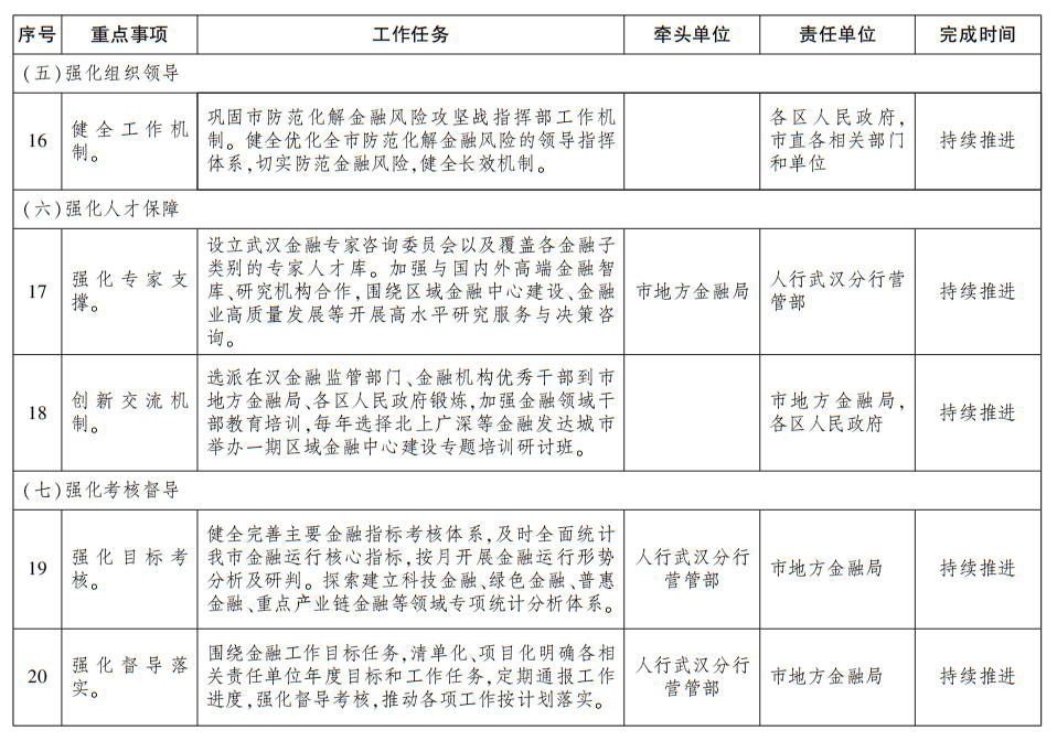 (一)强化组织领导。各区、各相关部门和单位要切实加强对金融工作的组织领导,按照本方案要求,制订具体工作方案,明确路线图、时间表,强化责任,推动各项工作任务落实落地。巩固市防范化解金融风险攻坚战指挥部工作机制,健全优化全市防范化解金融风险的领导指挥体系,切实防范金融风险。