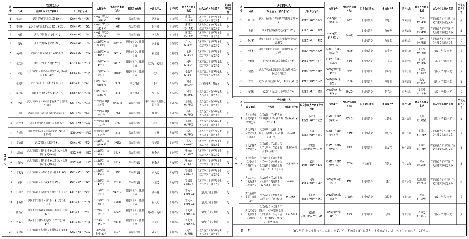 长江日报讯(记者耿珊珊)2月22日,武汉市文明办、市法院联合推出今年第1批失信被执行人名单,共涉案37件,标的额1449.42万元,上榜者38名,其中包括31名自然人、7家法人。
