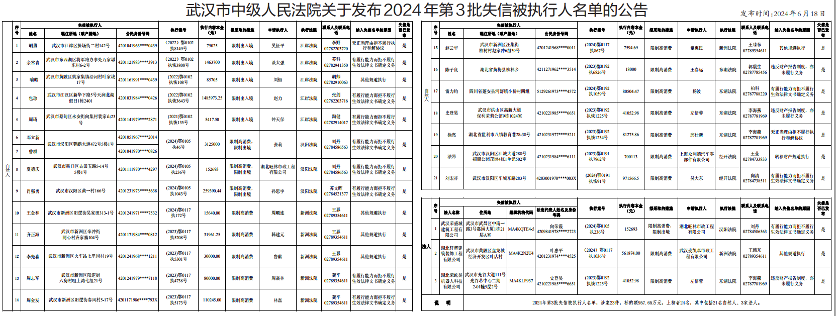 需要特别说明的是,人民法院定期在媒体曝光的失信名单只是失信被执行人名单库的一部分,更多实时失信信息请登录中国执行信息公开网查询,“中国执行”、“武汉市中级人民法院”微信公众号“司法公开”栏均可点击进入。失信被执行人履行完法律义务后,法院将依法屏蔽其失信信息,并通过中国执行信息公开网及时推送。
