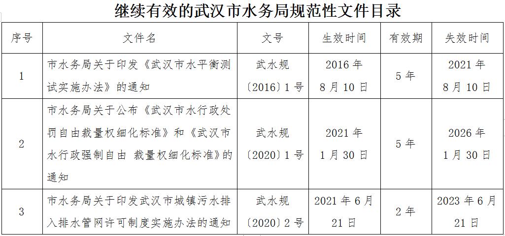 为全面推进依法行政,加强法治机关建设,深化“放管服”改革,优化水务领域良好营商环境,我局根据《武汉市行政规范性文件管理办法》规定,对2018——2021年制发和《市水务局关于公布继续有效的武汉市水务局规范性文件的通告》(武水〔2018〕147号)确认继续有效的武汉市水务局规范性文件进行了清理,现将清理结果公布如下: