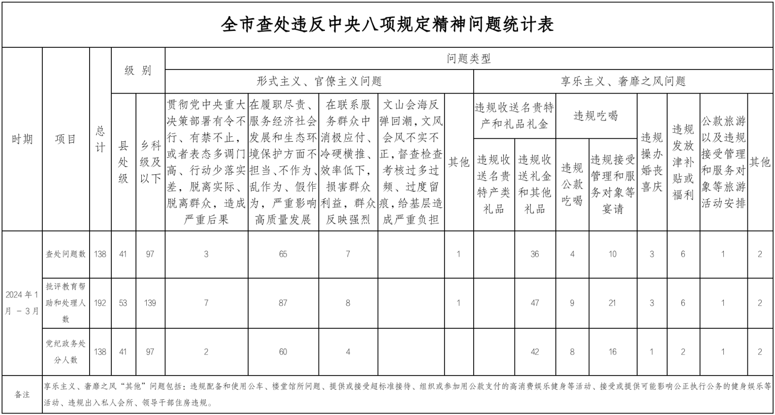 2024年第一季度,武汉市查处违反中央八项规定精神问题138起,批评教育帮助和处理192人,其中,党纪政务处分138人。从查处问题类型看,在履职尽责、服务经济社会发展和生态环境保护方面不担当、不作为、乱作为、假作为共查处问题65起,占查处的形式主义、官僚主义问题总数的85.53%。查处违规收送名贵特产和礼品礼金问题36起,占查处的享乐主义、奢靡之风问题总数的58.06%。