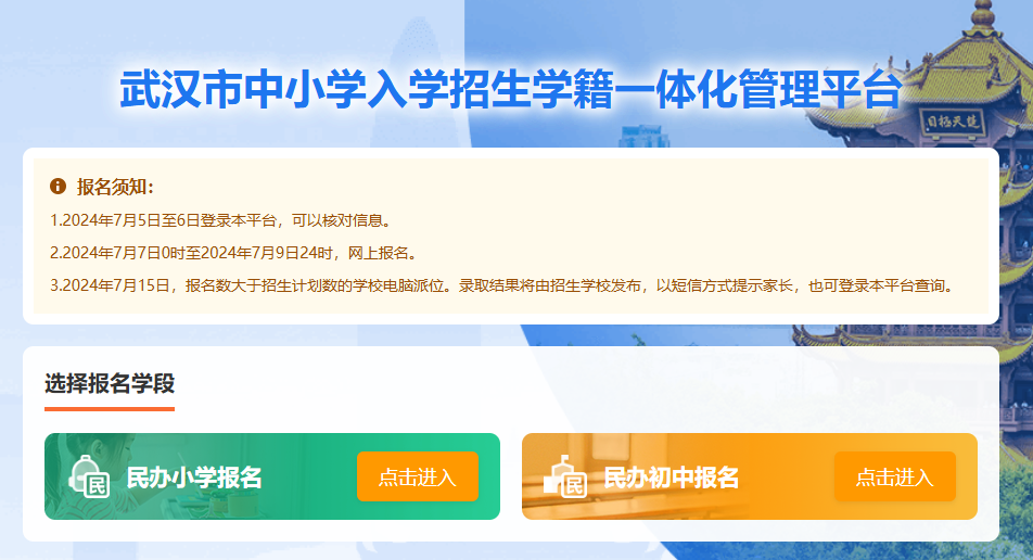 2024年,我市民办小学和民办初中招收新生统一使用《武汉市中小学入学招生学籍一体化管理平台》(以下简称“平台”)实行网上报名,时间为7月7日-7月9日。