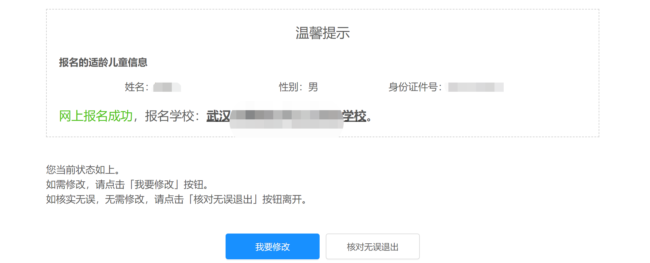 【特别提示】如点击“我要修改”并“确认”,无论是否修改具体内容,都将清除已保存的报名意愿数据,需按流程重新选择学校报名并按“确定”按钮提交。请谨慎操作,勿随意点击“我要修改”。