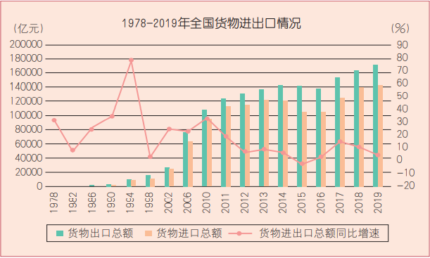 改革开放以来,对外贸易成为我国经济稳定、持续、快速发展的重要支柱和引擎之一,是我国经济迅速融入世界经济重要的纽带和桥梁。我国货物进出口总额从 1978 年的 355 亿元攀升到 2019 年的 315627 亿元,从无足轻重的贸易小国迅速崛起为名副其实的贸易大国。
