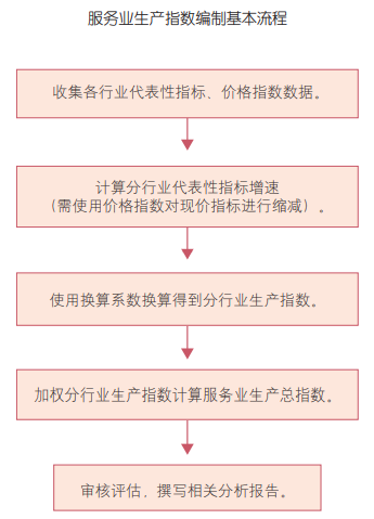 我国服务业生产指数计算选用拉式算法(用基期数量作权数),基本方法是: 首先分行业大类(房地产业为行业中类)计算分行业大类代表性指标不变价增速(以上年为基期),当代表性指标为现价指标时需价格缩减后再计算增速;然后使用换算系数对分行业大类的代表性指标增速进行换算,得到分行业大类的生产指数,使用换算系数目的是通过换算把代表性指标增速转换为所代表行业的产出增速;最后按照每个行业大类在所属门类的增加值占比作为权重加权合成分行业门类生产指数,再根据各行业门类在服务业增加值中占比作为权重加权计算服务业生产总指数。