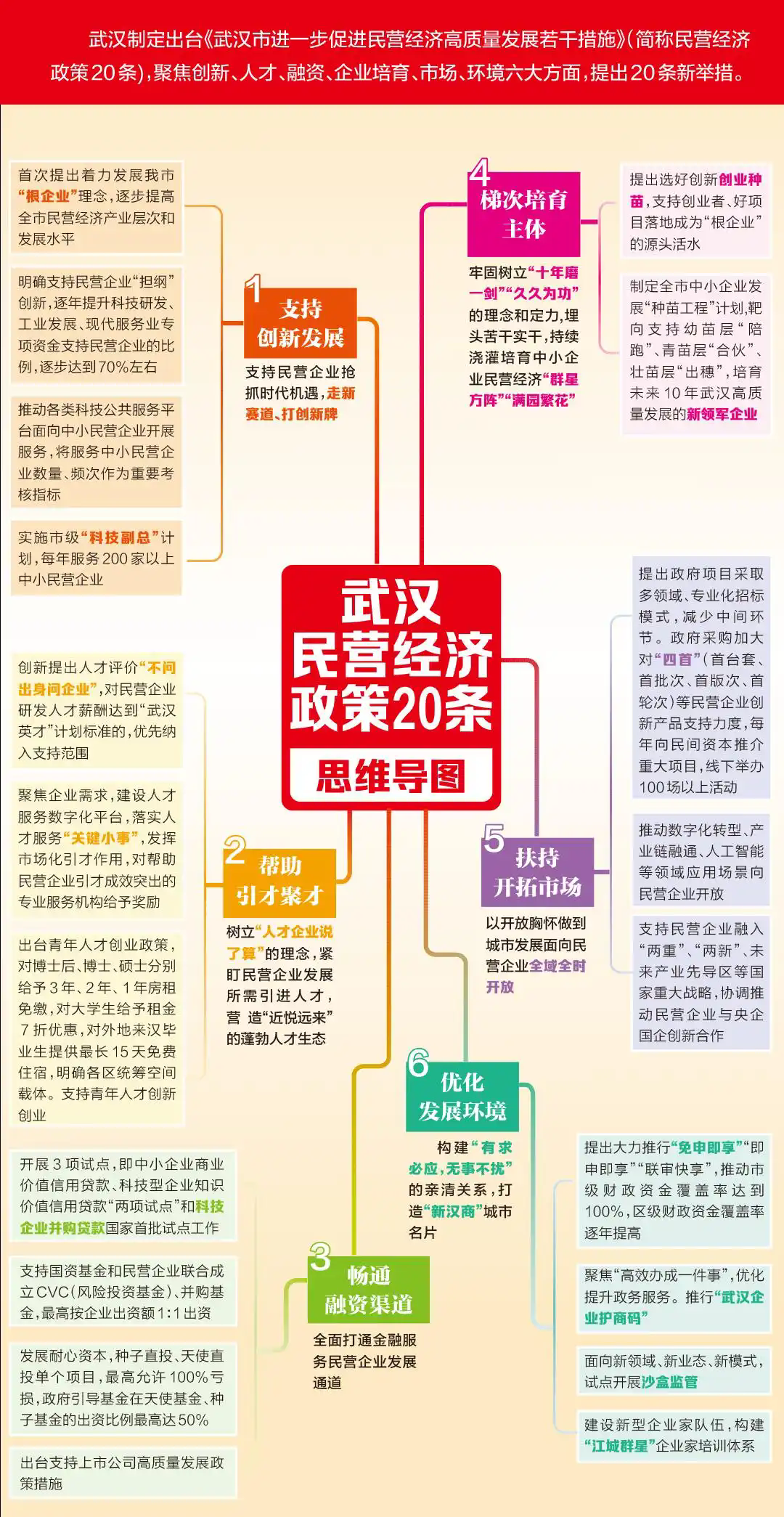 武汉立足破解制约民营企业发展的创新难、融资难、引才难、准入难等问题制定出台《武汉市进一步促进民营经济高质量发展若干措施》,也被称为“民营经济政策20条”