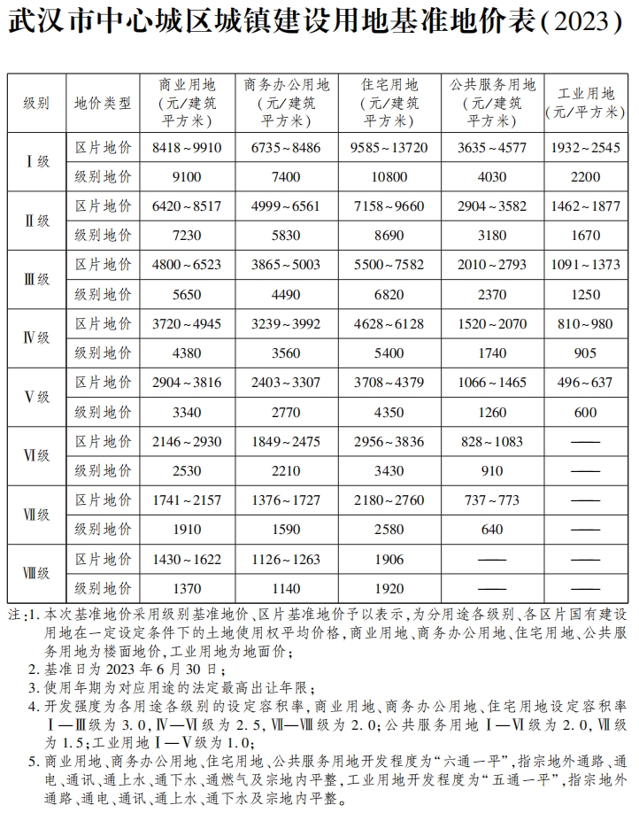 为促进全市土地市场持续健康发展,确保基准地价成果符合经济社会发展和土地市场运行实际,根据国家和省有关规定,市自然资源和城乡建设局组织对我市中心城区2018年基准地价成果进行了更新,经省自然资源厅批复同意,制订了新的中心城区城镇建设用地基准地价标准。经研究,现将《武汉市中心城区城镇建设用地基准地价表(2023)》《武汉市中心城区城镇建设用地基准地价图(2023)》予以公布,并就有关事项通知如下: