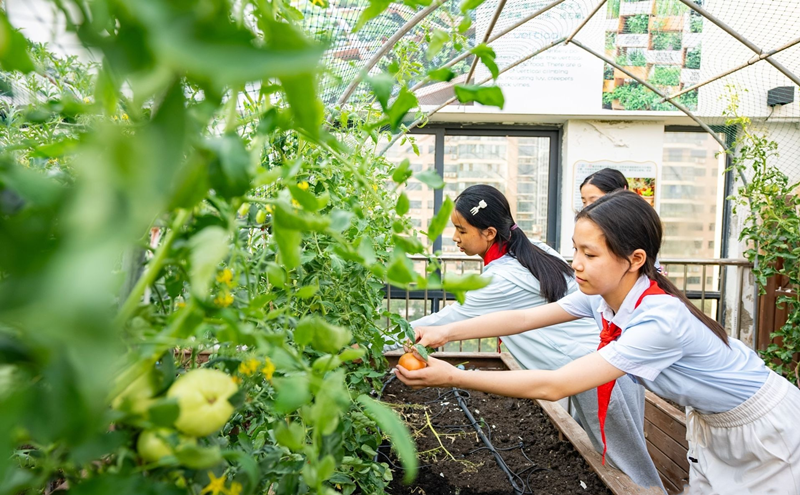 学生们在绿色驿站采摘蔬果。图片来源:湖北日报客户端