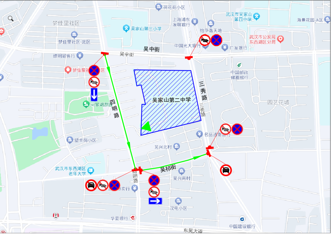 6月20日、6月21日(每日7时至17时30分),6月22日(7时至12时)期间,四明路(吴中街至吴祁街)实行机动车由北向南单向通行,并视情进行管控;吴祁街(四明路至三秀路)实行机动车由西向东单向通行,并视情进行管控;三秀路(吴中路至东吴大道)、吴中街、四明路、吴祁街禁止机动车停放。