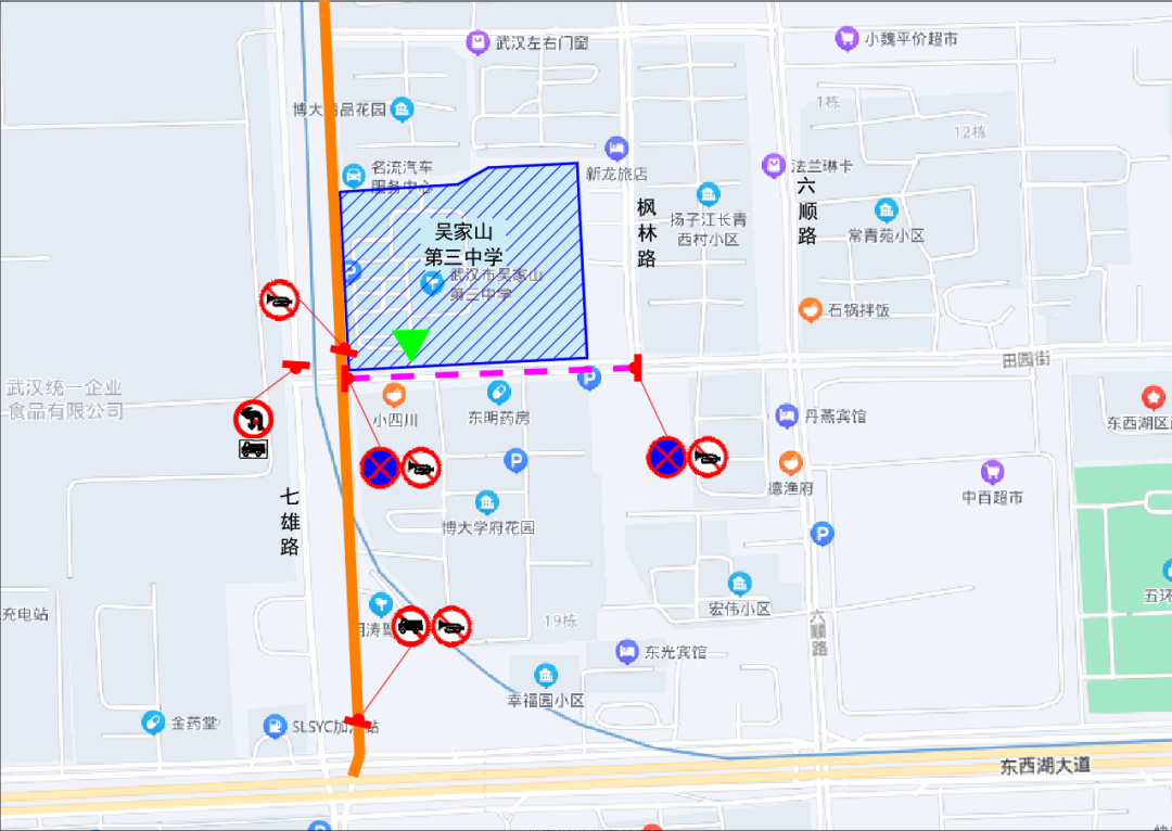 6月20日、6月21日(每日7时至17时30分),6月22日(7时至12时)期间,田园街(枫林路至七雄路)禁止机动车停放、鸣笛;七雄路(107国道至东吴大道)东侧道路禁止货车通行、停放。