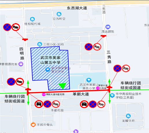 6月20日、6月21日(每日7时至17时30分),6月22日(7时至12时)期间,吴金路(十全路至恒大嘉园小区门口)禁止机动车通行、停放;十全路(金山大道至吴金路)禁止机动车停放、鸣笛;十全路(吴金路至东吴大道)、新城十一路等邻近道路,允许送考车辆单排顺向停放。