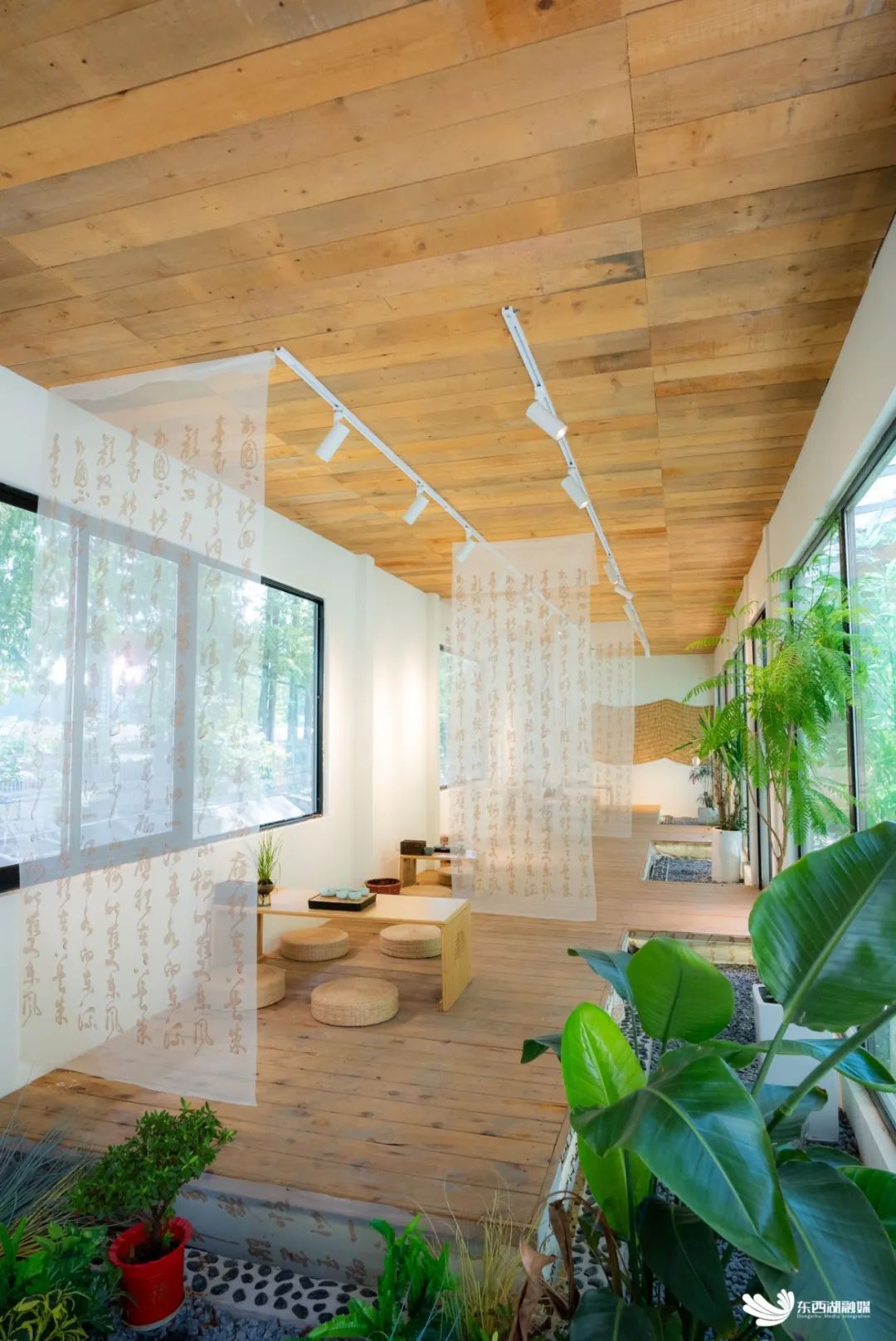 美学社以白色和木色的中性色调为主,木质地板的温柔质感、玻璃天窗引入的自然光线以及室内外的绿色植物装饰,营造出一种亲近自然、生机盎然的宁静氛围。美学社里,还摆放着孩子们亲手制作的各类手工艺品。墙上挂满了孩子们的书画作品,每一笔都充满了童真与想象。