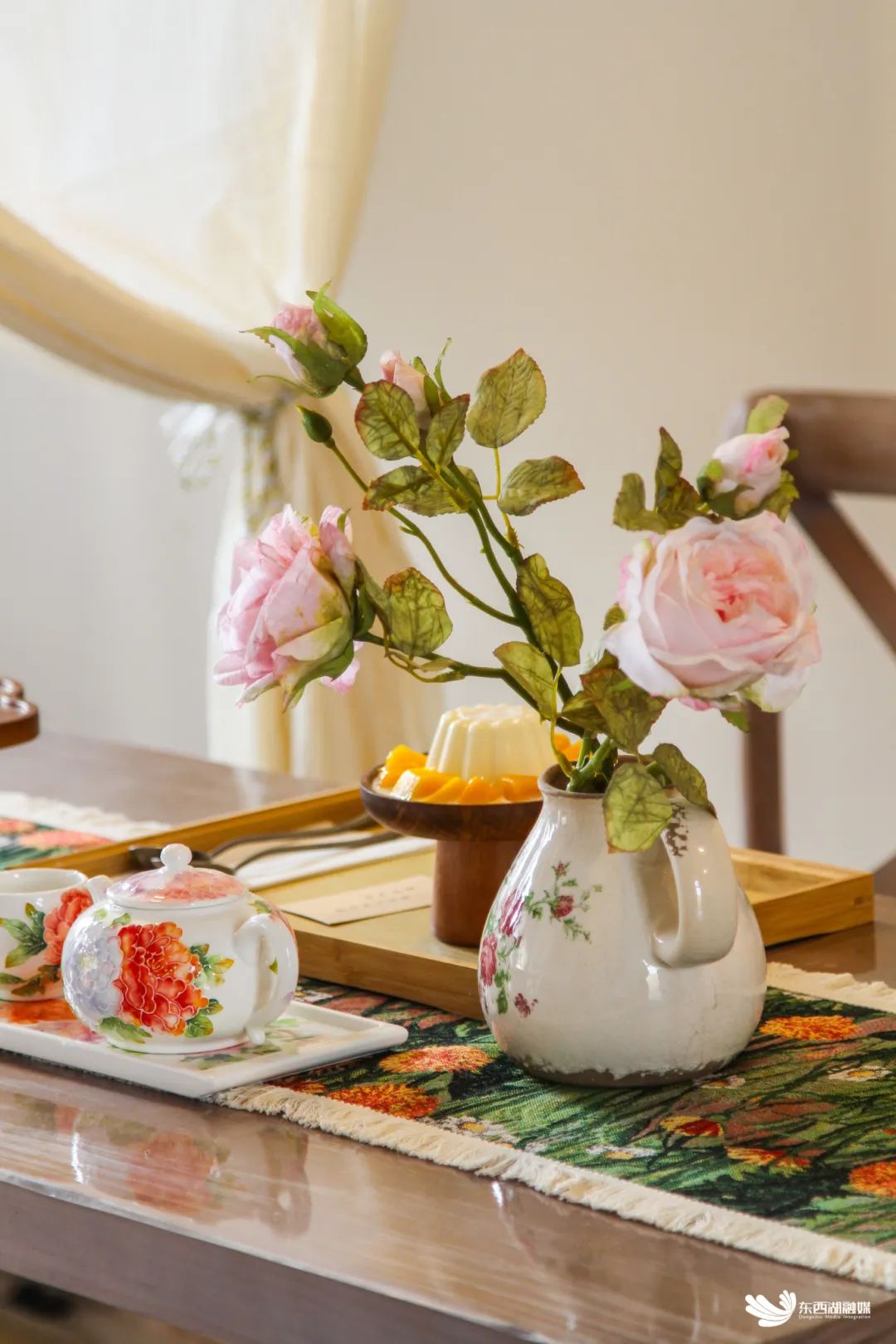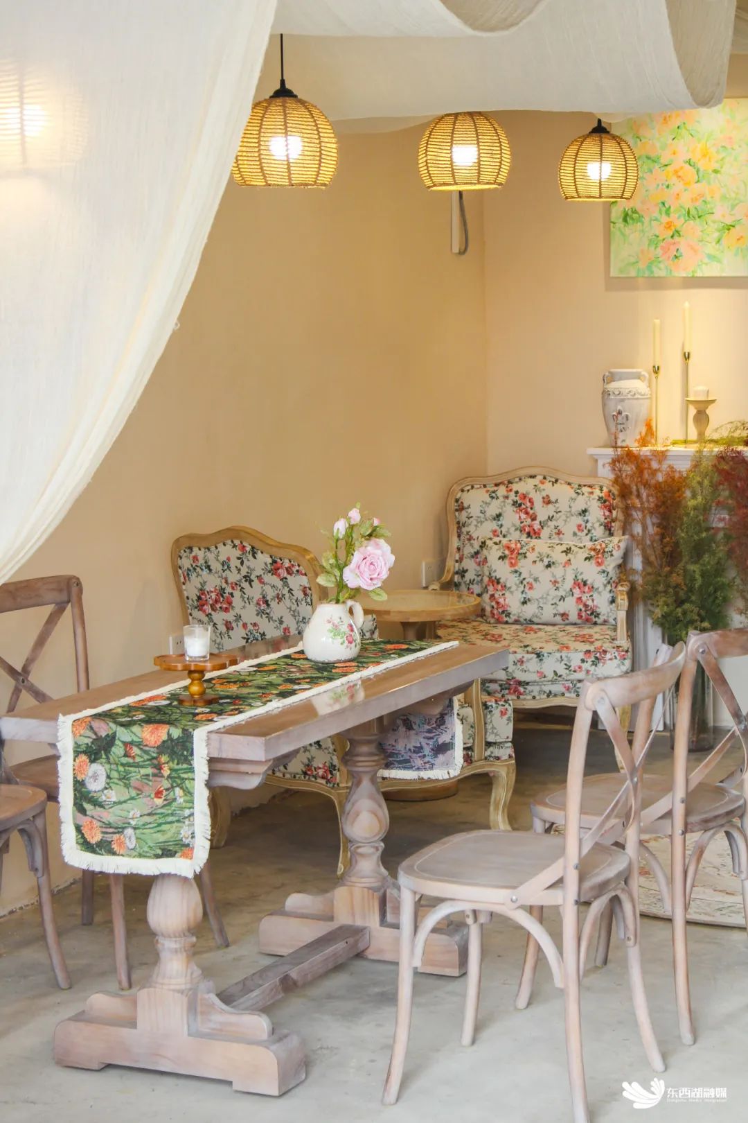 绿叶黄花爬满墙壁,木质窗户静静敞开,一阵风来,白色蕾丝窗帘微微扬起……走进花甜喜柿糖水铺,处处都能感受到甜美的芬芳和田园的惬意,木质家具、碎花桌布、景德镇订制的手绘茶具,点一个芒果布丁,吃一份豆花,泡上一壶茶,看窗外云卷云舒,美好浪漫的时光在这里被具象化。