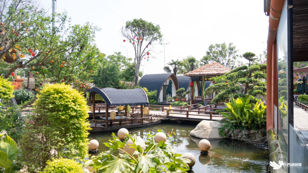 走进院内,花草、金鱼、荷花、茅草屋等元素点缀各处,让人恍若置身江南水乡的渔家酒肆。渔船造型的包间,在高大的树木和蜿蜒的溪流衬托下,别有一番风味。树上精心设置了各种俏皮灯带,白天显得可爱,夜间华灯初上则多一分浪漫。