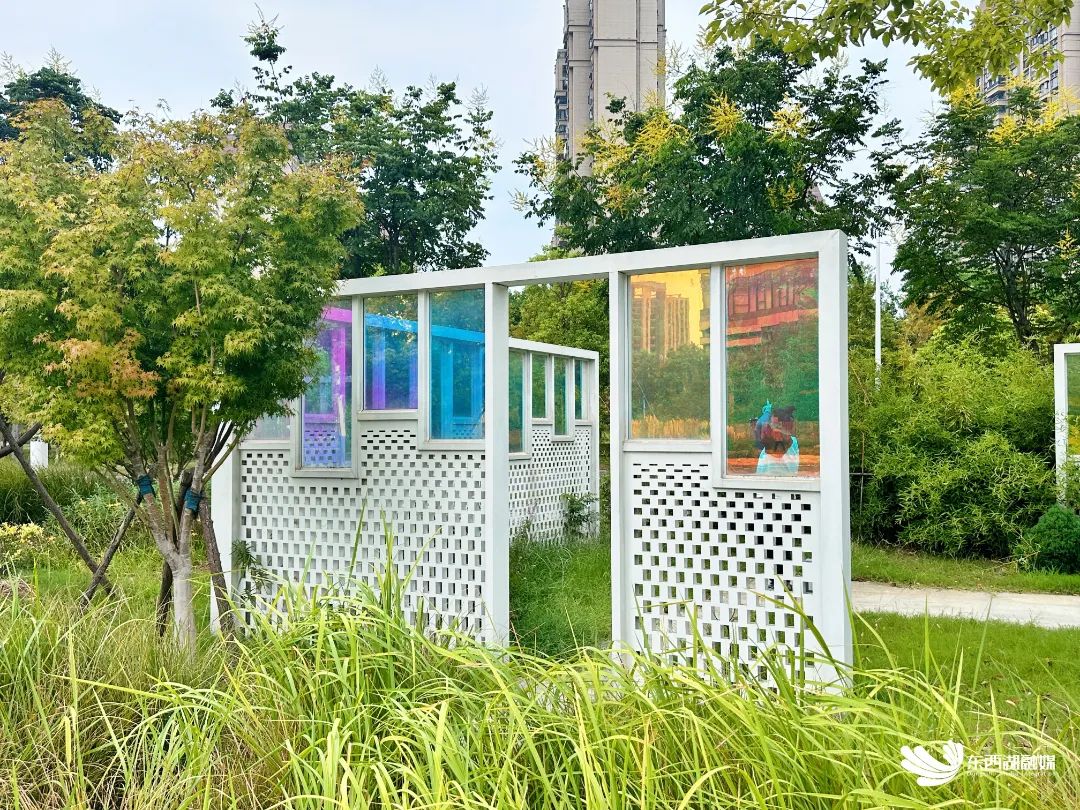 幻彩花园内的艺术装置在阳光的照耀下折射出彩虹般的色彩。