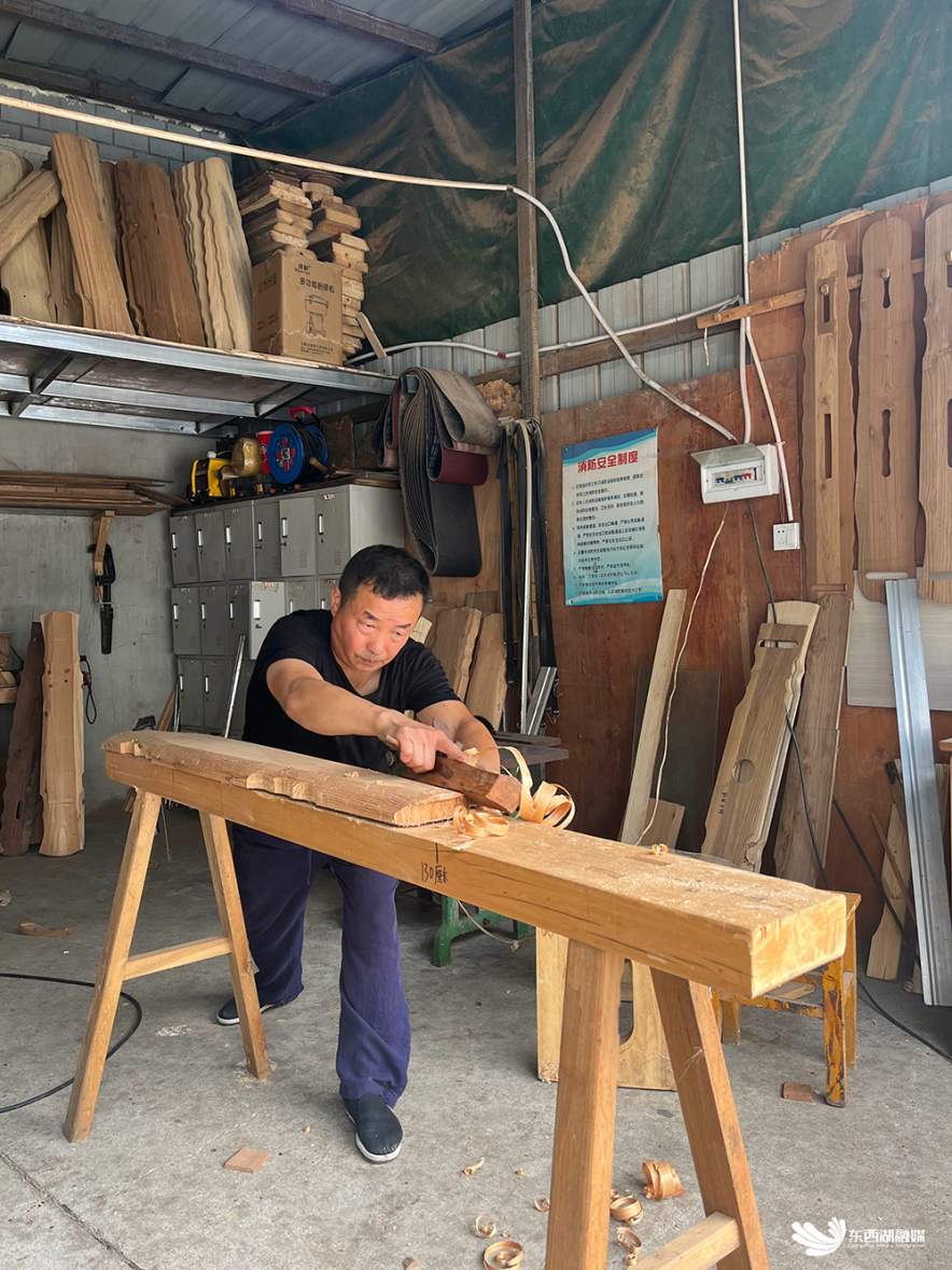 记者在吴友全的制琴作坊看到,在一间屋子墙面上,大大小小的制琴工具分门别类样样俱全。一旁的制作台上,摆放着一张古琴的半成品。吴友全小心翼翼的用凿子凿着木板,随着凹槽的逐渐显现,琴的轮廓也渐渐清晰起来。外面不远处的屋子里,则整齐码放着收藏多年的木料。