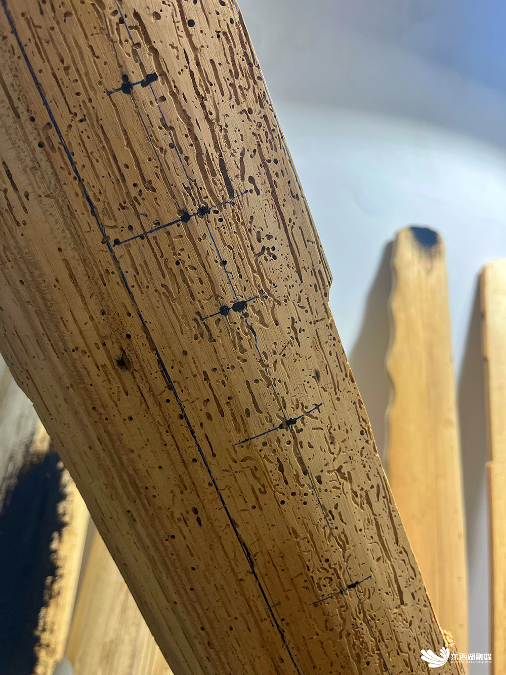吴友全说,为了防止古琴日后变形和皲裂,斫琴材料一般要在自然常温、通风透气的地方放置一两年后才可使用,而他积攒的这些木料系梓木和杉木,多是在贵州等地搜寻回来的拆房子老料。吴友全指着一块满是虫眼的木材,告诉记者这是块好料,多孔结构对声音的传导更为显著。