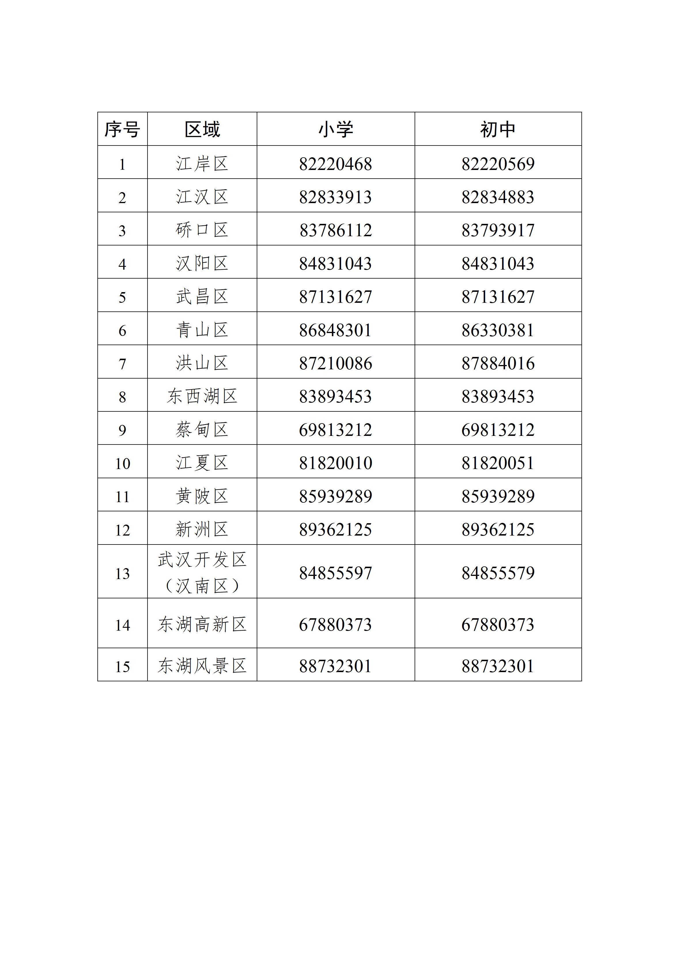武汉市各区义务教育阶段新生入学招生咨询电话