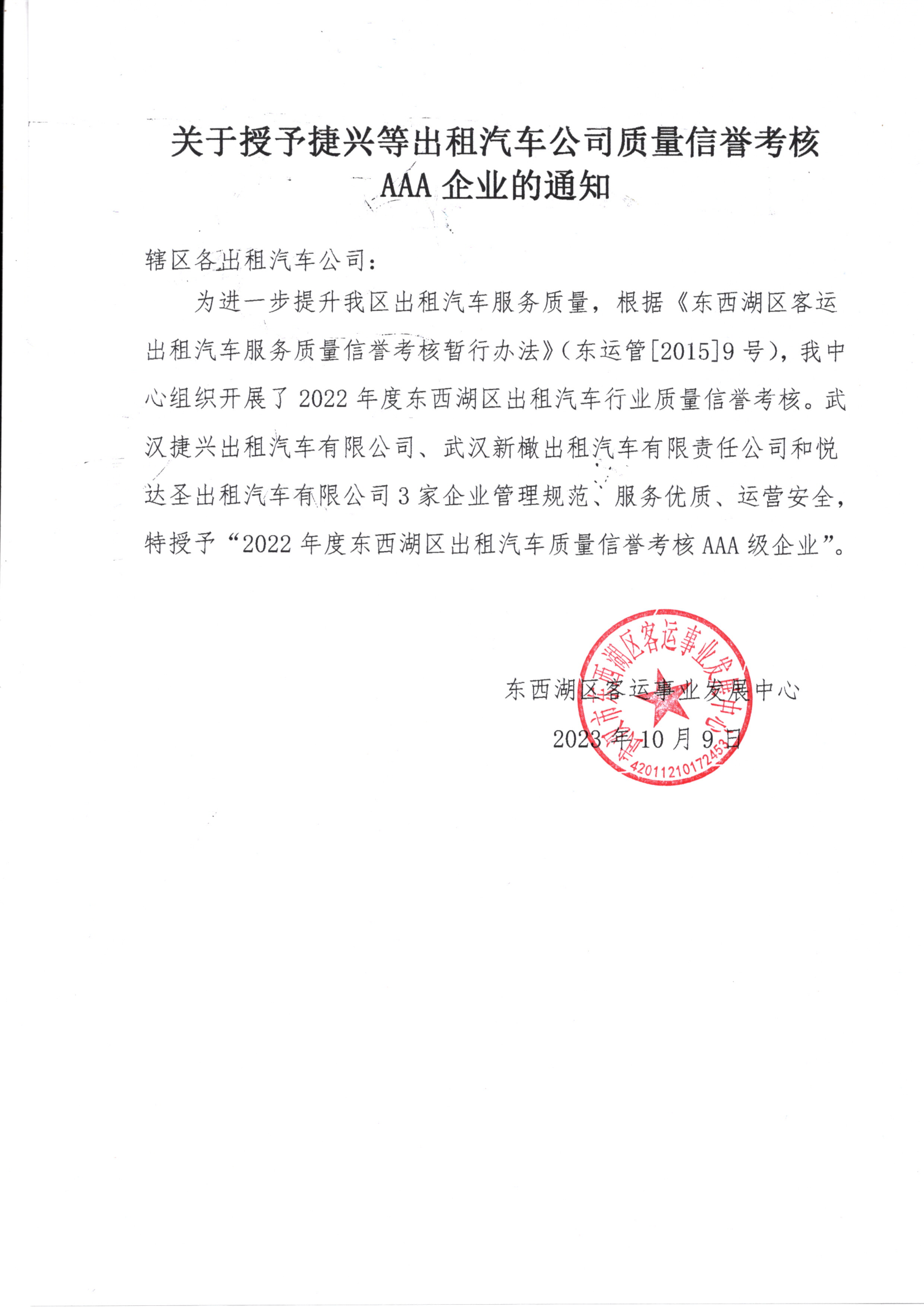 关于授予捷兴等出租汽车公司质量信誉考核AAA企业的通知