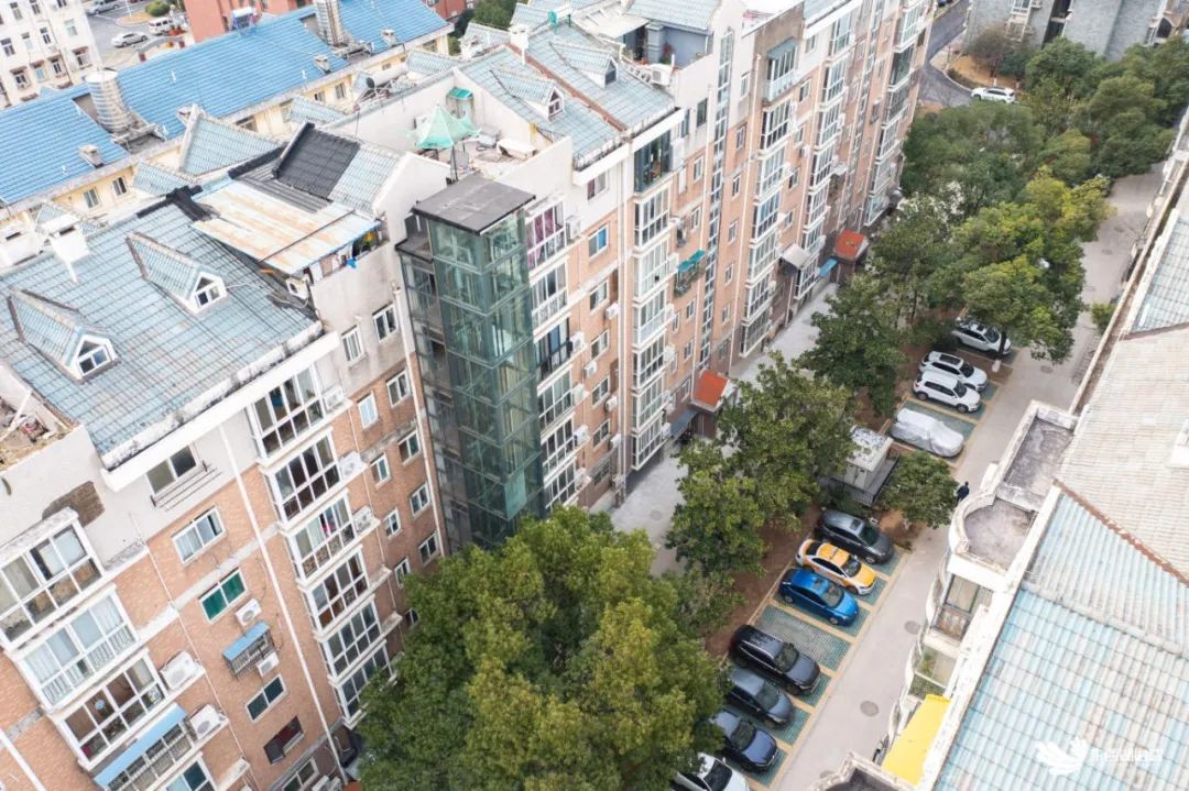 在各方的大力推动下,小区加装电梯工程于2024年8月完工并投用,全玻璃观光井道电梯设立在与步梯平行的楼栋外侧,大大方便居民的同时也尽可能减少了对房屋的光线遮挡。