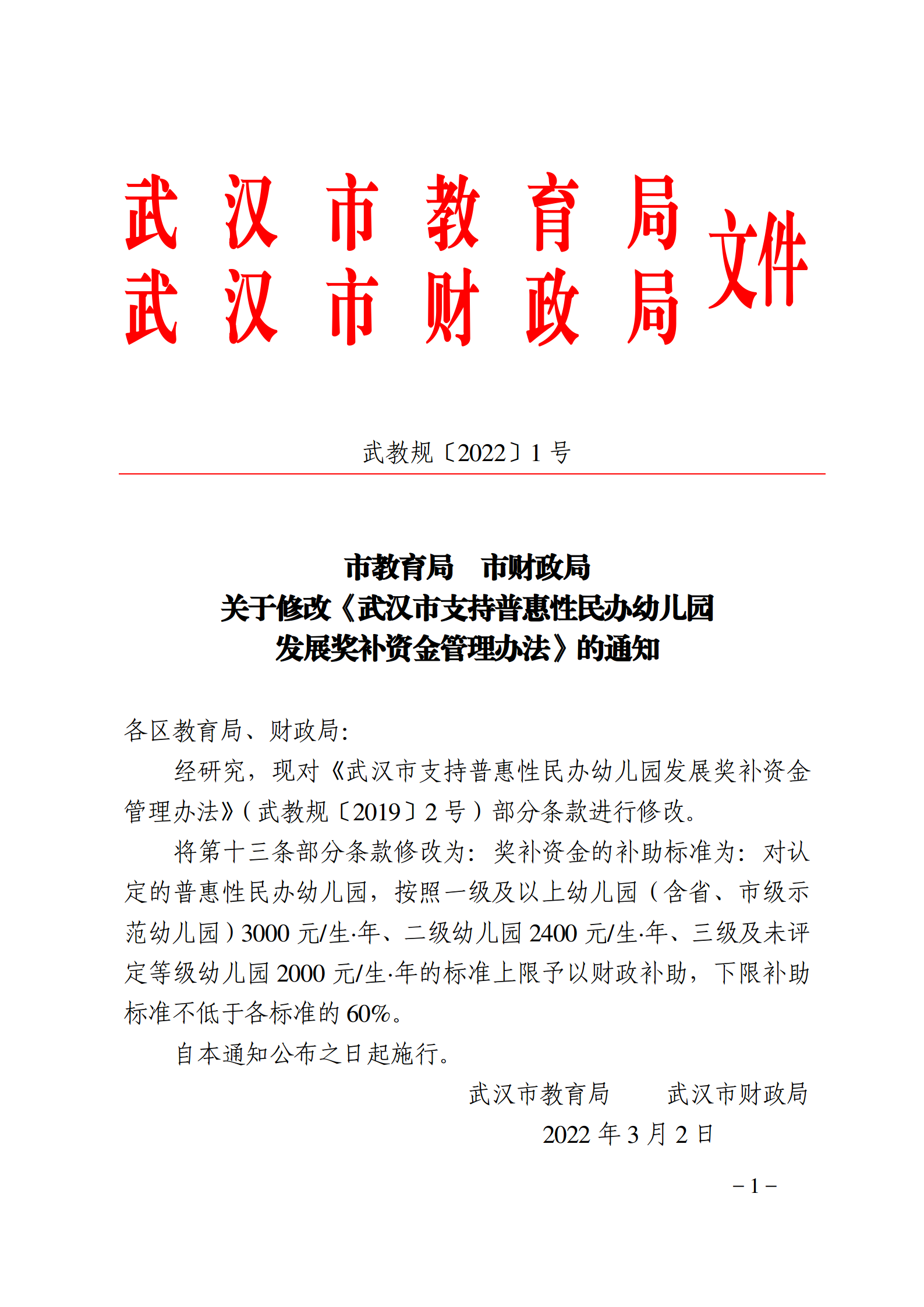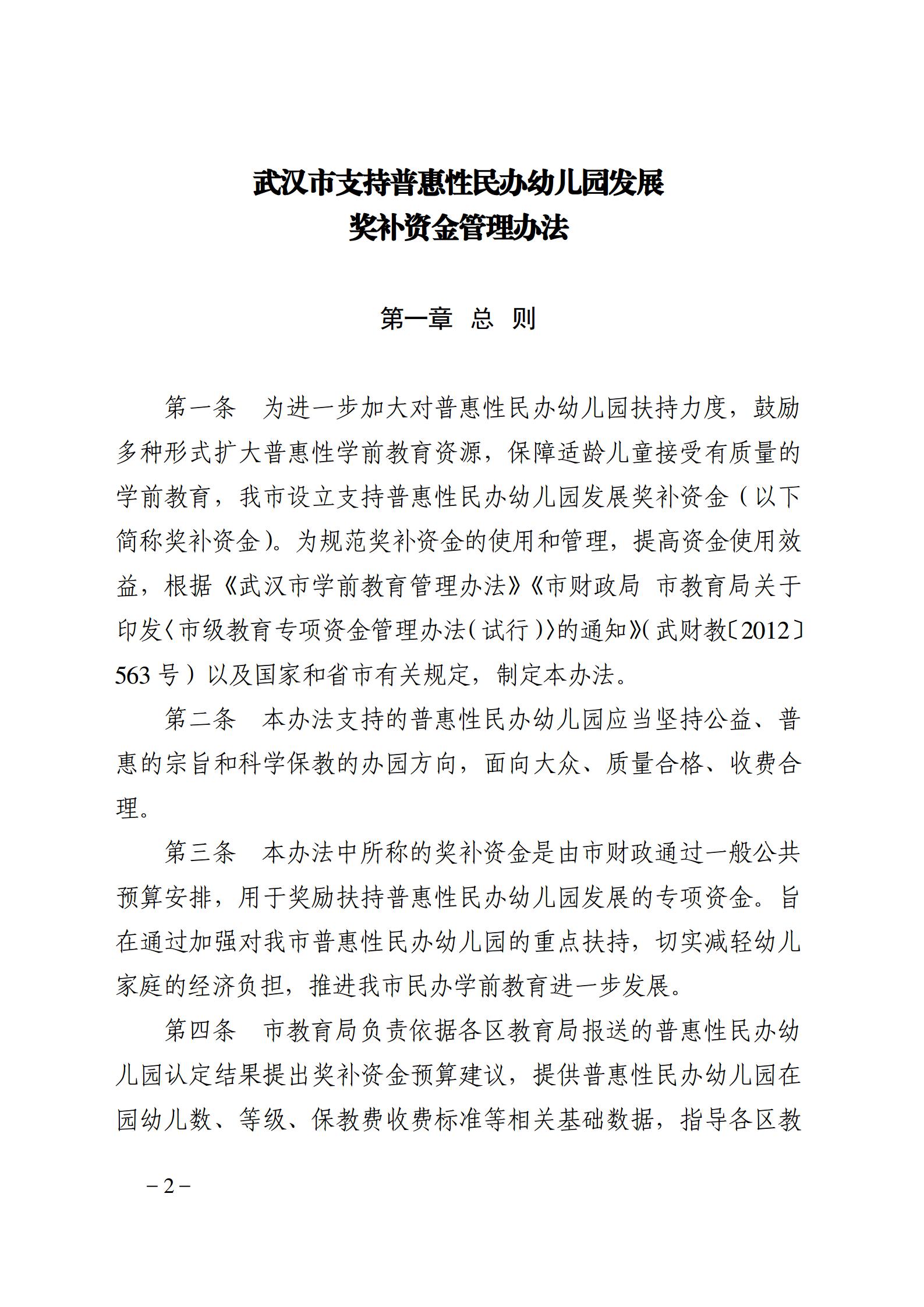 市教育局 市财政局关于修改《武汉市支持普惠性民办幼儿园发展奖补资金管理办法》的通知