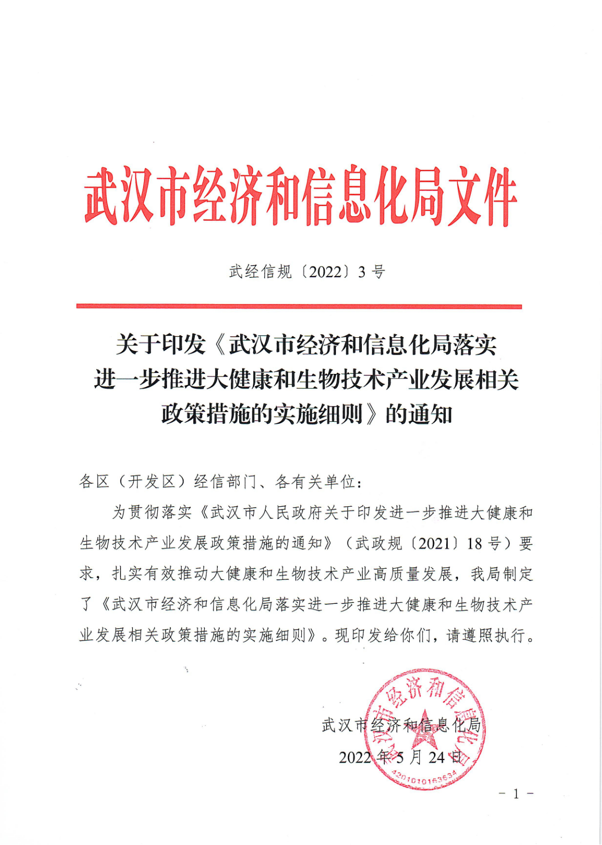 关于印发《武汉市经济和信息化局落实进一步推进大健康和生物技术产业发展相关政策措施的实施细则》的通知