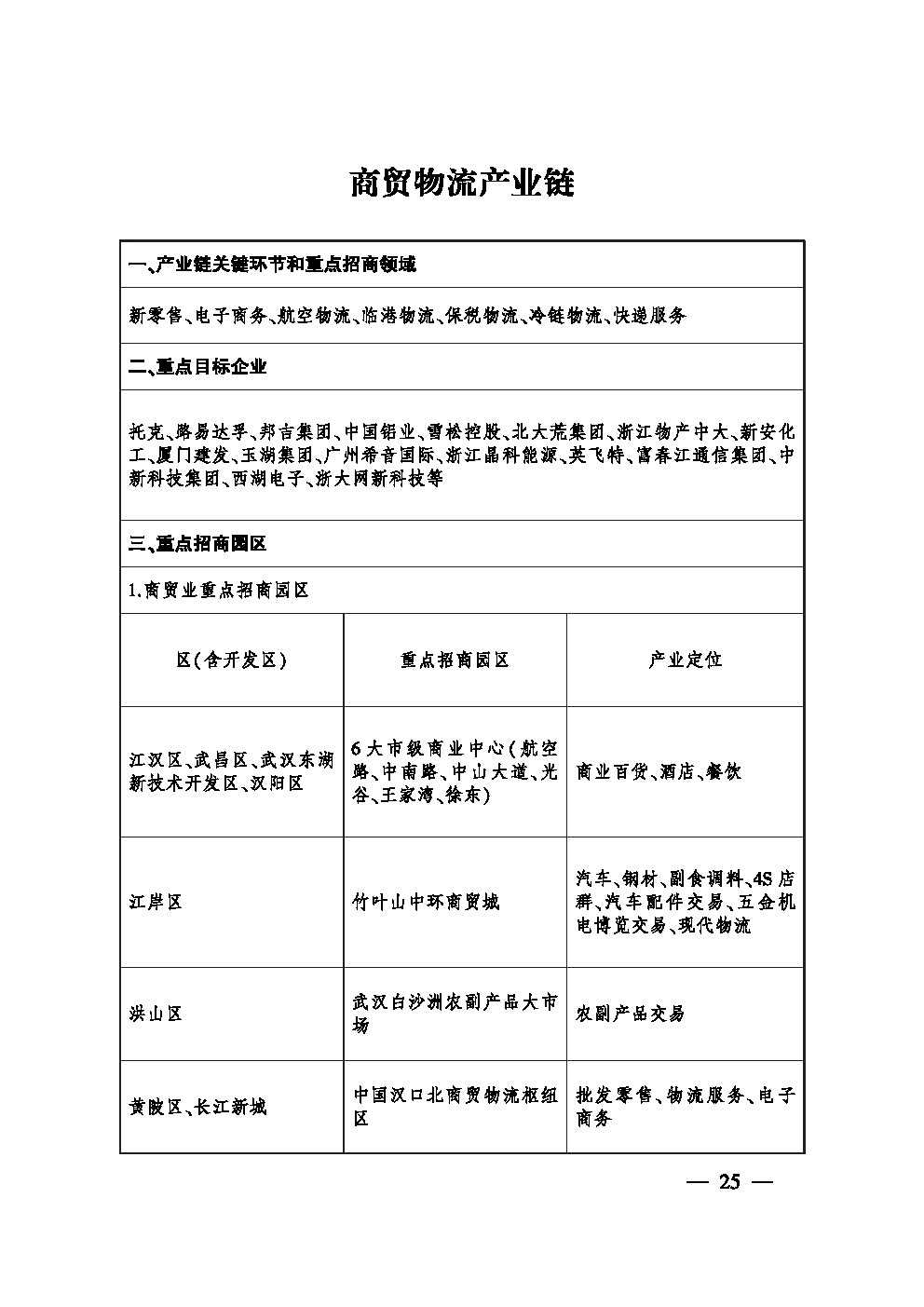 (一)制定重点产业招商图谱。精准精细绘制武汉市重点产业招商指南(2021),紧盯产业链缺失环节和短板弱项,明细“965”产业体系各个产业的产业图谱、目标企业清单、产业集聚区域。各区(含开发区,下同)根据“一区一表”“一业(链)一表”,统筹整合本地产业链供应链需求,制定各区“一谱一策三清单”(一本产业发展图谱,一套促进产业发展政策,梳理形成重点企业、重点项目、重点平台等三张清单),深化细化招商路径,加强产业平台建设,实施挂图作战、对标对表推进,切实提升优化产业生态。