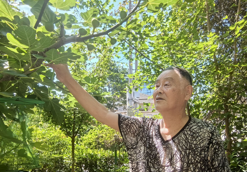 张崇清在小花园检查无花果长势情况。图片来源:湖北日报客户端