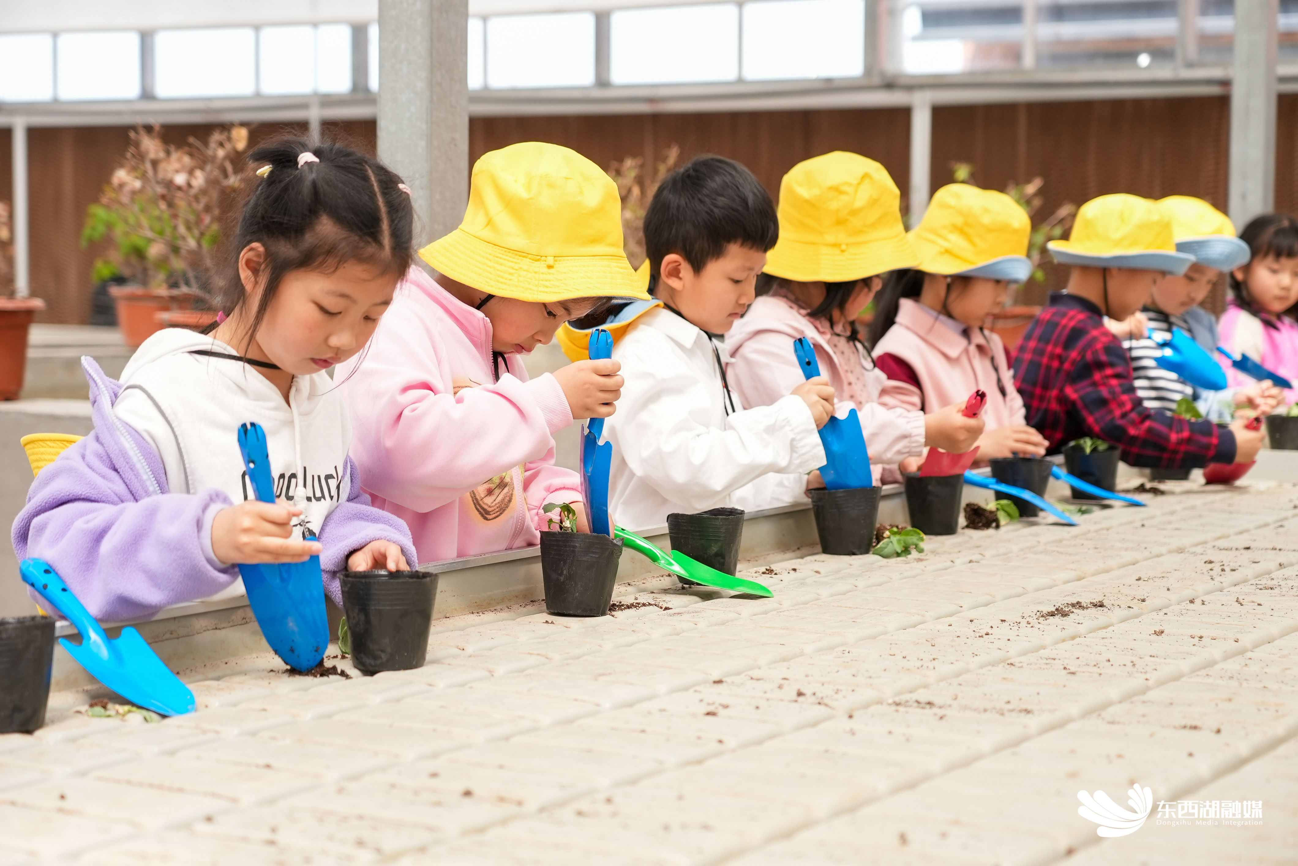 “小朋友们,跟着我这样,先用小铲子把盆里的土扒开,然后把你们手边的小绿植放到盆中间……”步入空港湿地花田温室大棚,一股清新的空气迎面扑来,工作人员耐心地向小朋友们讲解绿植种植的知识和技巧。在工作人员的指导下,小朋友们开始劳动实践,他们小心翼翼地挖土、播种、浇水,忙得不亦乐乎。