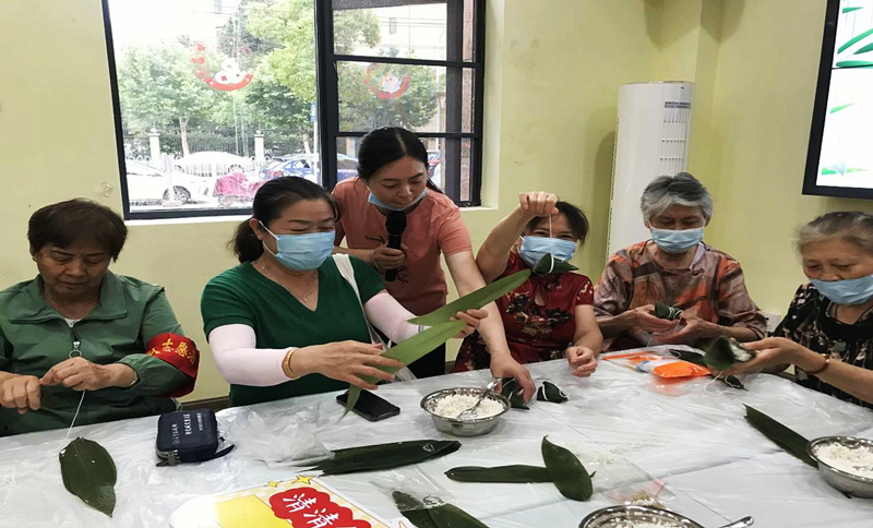 随后到了包粽子环节,工作人员将提前泡好的糯米、蜜枣、粽叶等新鲜食材整齐地摆放在桌子上。还请来了辖区包粽子民间高手张玉琴老师现场手把手教大家,“左手窝着粽叶,把叶子卷成漏斗形状的一个角,再往里面装上料,要压紧压实,然后捏紧两角这样包起来……”不一会儿,一个个漂亮的粽子就包好了,现场大家有说有笑,其乐融融。