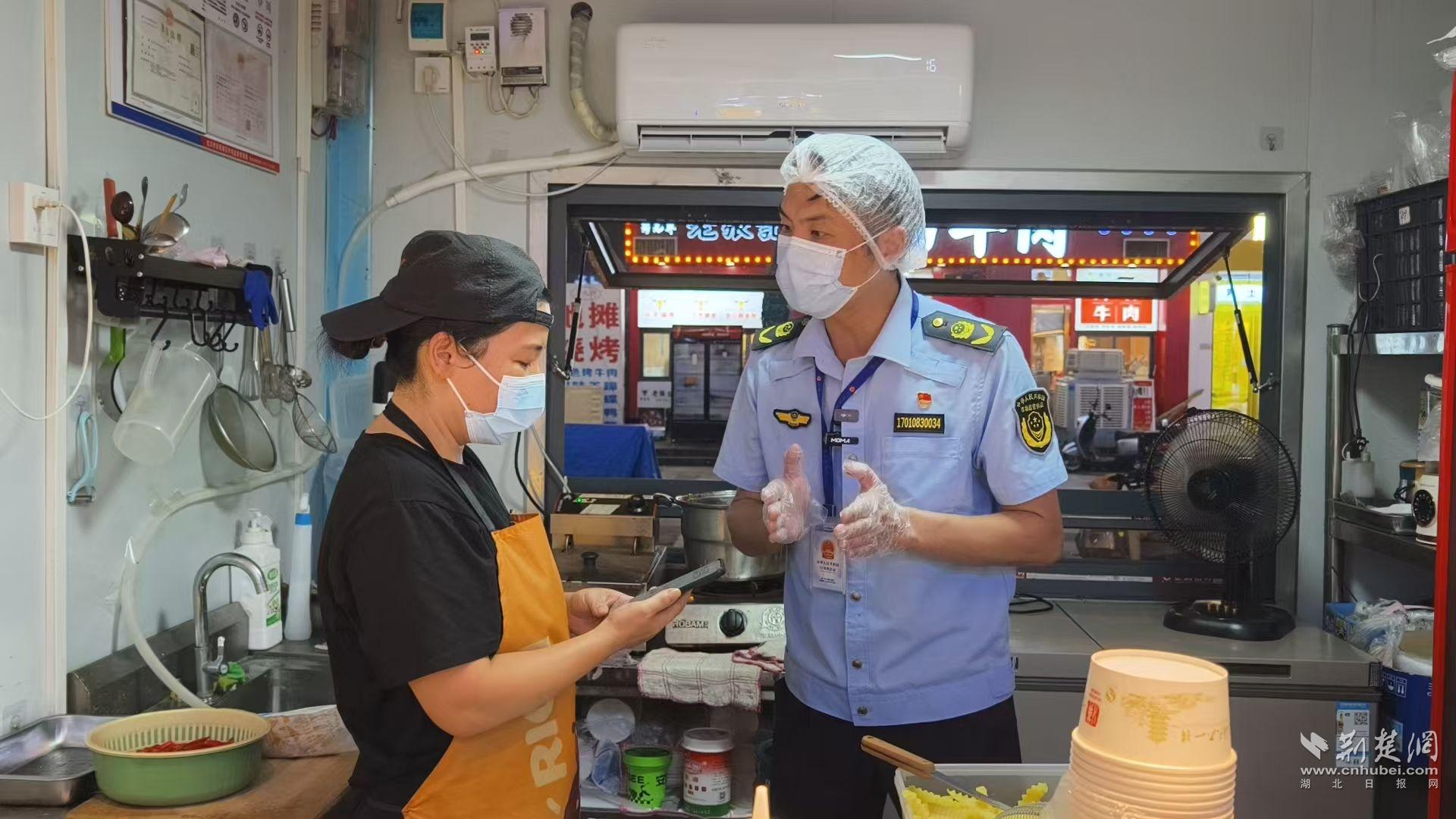 当晚7时许,灯光渐起,暑热未消,吴家山仟那夜市已经熙熙攘攘人来人往。“您的营业执照要公示出来。”“麻烦出示一下你们的进货台账......”走在夜市街上,执法人员一边与商家打招呼,一边逐一检查他们的营业执照、食品经营许可证、进货台账等信息。由于高温暑热,食材容易变质,因此,冰箱、冷藏柜就成了执法人员检查的重点。