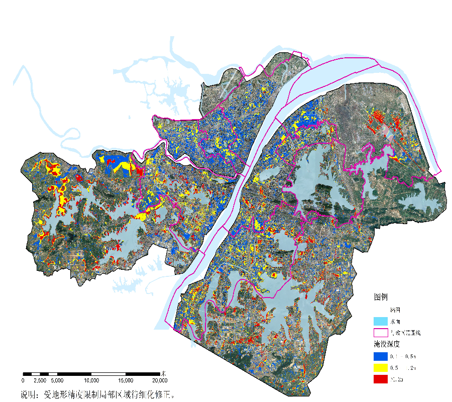 备注:此图以武汉市百年一遇雨型(即:最大小时降雨126毫米,最大1日降雨365.4毫米,最大3日降雨508.9毫米,最大7日降雨669.7毫米)为设定条件,通过模型演算得出。