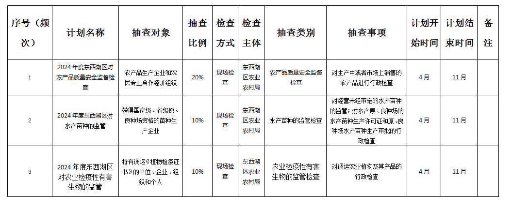 欧博官网 农业农村局2024年双随机年度抽查计划表