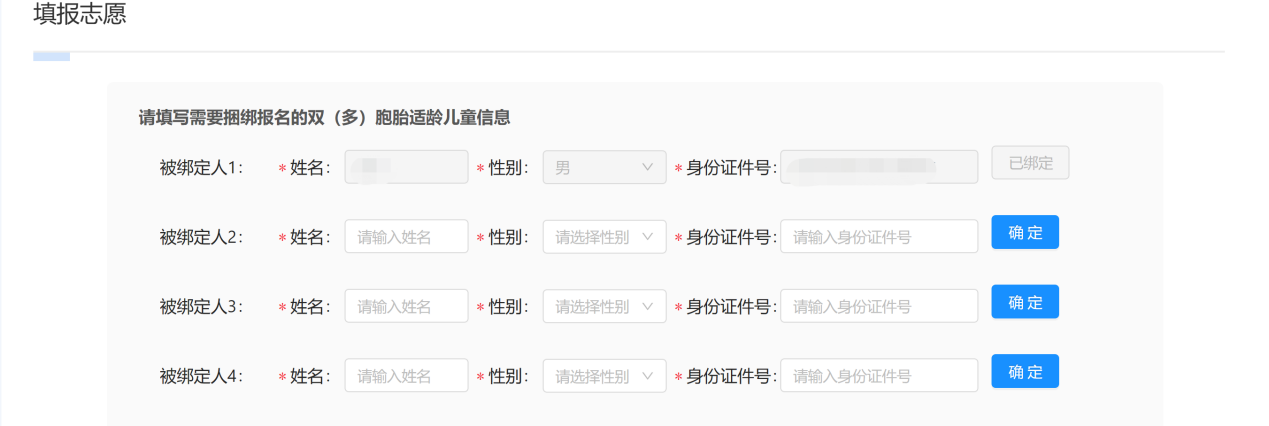 上一步骤勾选“是”,点击“下一步”后,请按系统提示填写需要捆绑报名的双(多)胞胎学生信息,只需要填写被捆绑人的姓名、性别、身份证件号,点击“确定”按钮,完成双胞胎捆绑。如果是多胞胎,继续填写下一个被捆绑学生信息,并点击“确定”按钮,直至所有需要捆绑的多胞胎学生都捆绑完成。若信息填写有误,系统将提示无法完成捆绑。
