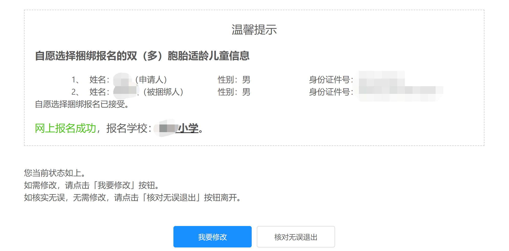 报名操作只能由申请人进行,操作步骤和单个学生报名步骤相同。选择报名学校并确认提交后,所有捆绑的双(多)胞胎学生将报名同一所学校。
